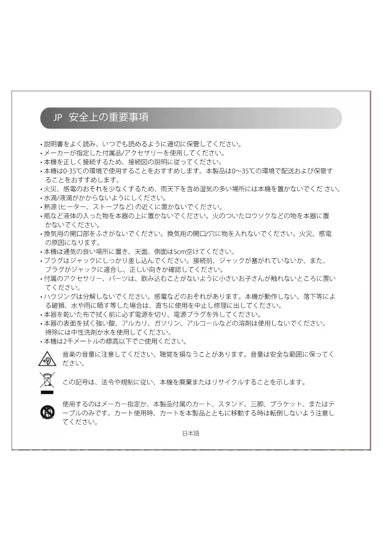 この記号は、法令や規制に従い、本機を廃棄またはリサイクルすることを示します。 使用するのはメーカー指定か、本製品付属のカート、スタンド、三脚、ブラケット、またはテ ーブルのみです。カート使用時、カートを本製品とともに移動する時は転倒しないよう注意し