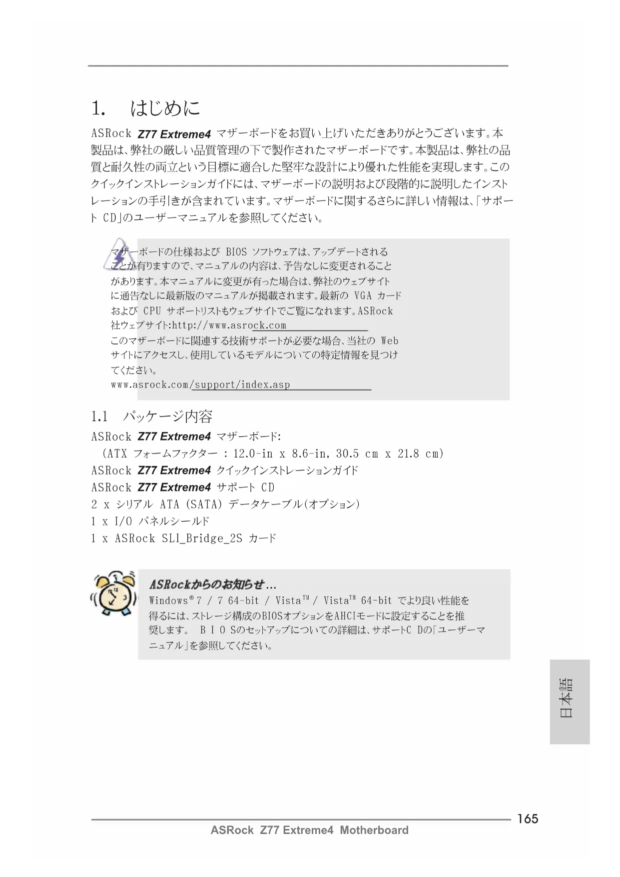 ASRock Z77 Extreme4 マザーボードをお買い上げいただきありがとうございます。本 製品は、弊社の厳しい品質管理の下で製作されたマザーボードです。本製品は、弊社の品 質と耐久性の両立という目標に適合した堅牢な設計により優れた性能を実現します。この クイックインストレーションガイドには、マザーボードの説明および段階的に説明したインスト レーションの手引きが含まれています。マザーボードに関するさらに詳しい情報は、「サポー ト CD」のユーザーマニュアルを参照してください。 マザーボードの仕様および BIOS ソフトウェアは、アップデートされる ことが有りますので、マニュアルの内容は、予告なしに変更されること があります。本マニュアルに変更が有った場合は、弊社のウェブサイト に通告なしに最新版のマニュアルが掲載されます。最新の VGA カード および CPU サポートリストもウェブサイトでご覧になれます。ASRock 社ウェブサイト:http://www.asrock.com このマザーボードに関連する技術サポートが必要な場合、当社の Web サイトにアクセスし、使用しているモデルについての特定情報を見つけ てください。 www.asrock.com/support/index.asp