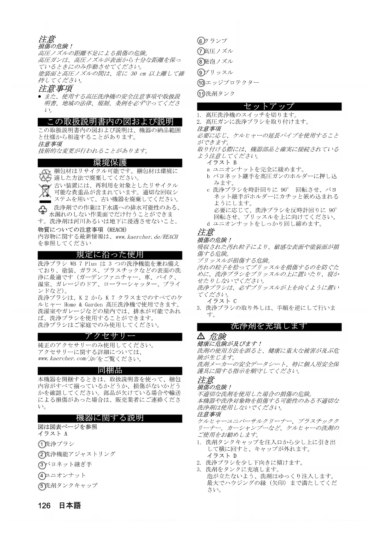 梱包材はリサイクル可能です。梱包材は環境に 適した方法で廃棄してください。 古い装置には、再利用を対象としたリサイクル 可能な貴重品が含まれています。適切な回収シ ステムを用いて、古い機器を廃棄してください。 洗浄剤での作業は下水溝への排水可能性のある、 水漏れのしない作業面でだけ行うことができま す。洗浄剤は河川あるいは地下に浸透させないこと。 物質についての注意事項 (REACH) 内容物に関する最新情報は、 www.kaercher.de/REACH