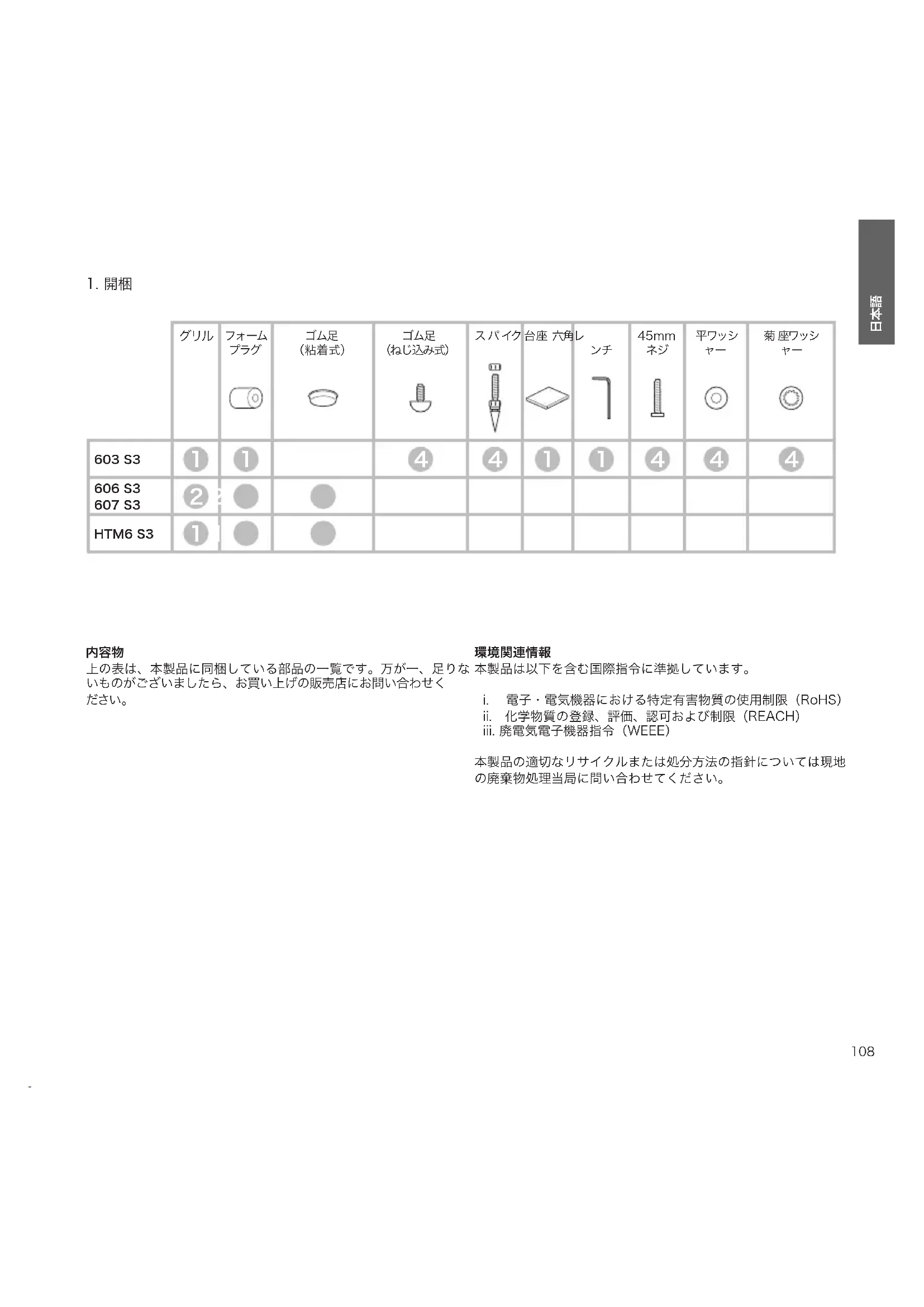 603 S3 603 S3は床置き専用です。適切な安定性を得るために、必ず付属 の台座を取り付けてください。そして付属のスパイクまたはゴム足 を取り付け、スピーカー が床 にしっかりと自立していることを確 認し