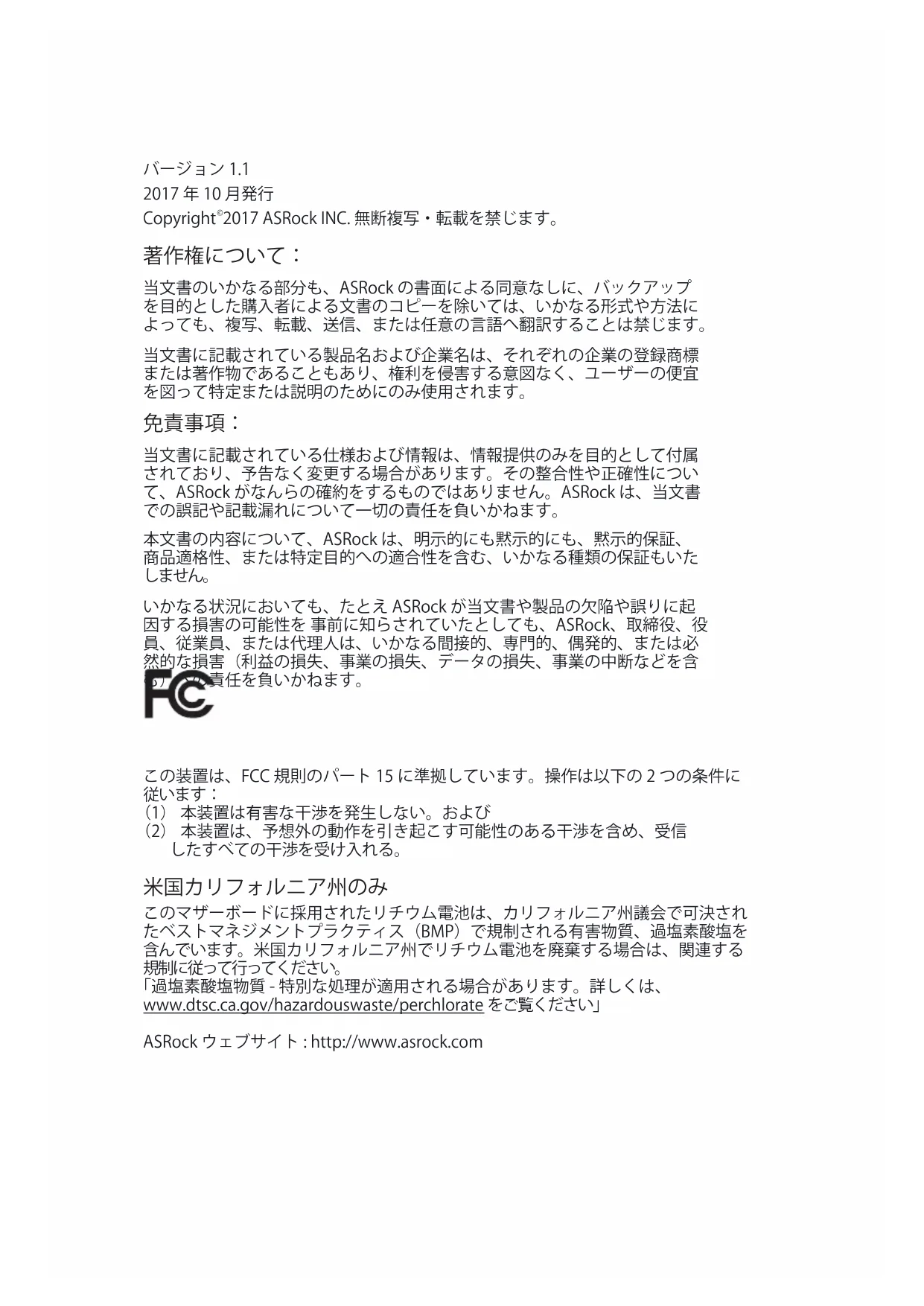 いかなる状況においても、たとえ ASRock が当文書や製品の欠陥や誤りに起 因する損害の可能性を 事前に知らされていたとしても、ASRock、取締役、役 員、従業員、または代理人は、いかなる間接的、専門的、偶発的、または必 然的な損害(利益の損失、事業の損失、データの損失、事業の中断などを含 む)への責任を負いかねます。 この装置は、FCC 規則のパート 15 に準拠しています。操作は以下の 2 つの条件に