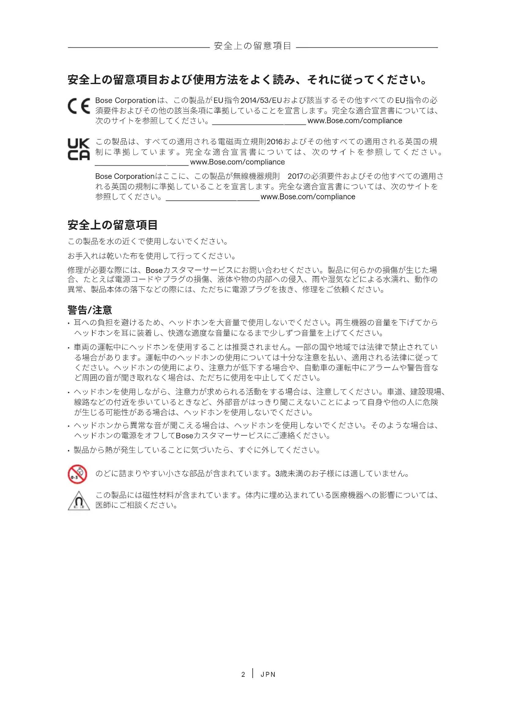 JPN 安全上の留意項目および使用方法をよく読み、それに従ってください。 Bose Corporationは、この製品がEU指令2014/53/EUおよび該当するその他すべてのEU指令の必 須要件およびその他の該当条項に準拠していることを宣言します。完全な適合宣言書については、 次のサイトを参照してください。 www.Bose.com/compliancewww.Bose.com/compliance この製品は、すべての適用される電磁両立規則2016およびその他すべての適用される英国の規 制に準拠しています。完全な適合宣言書については、次のサイトを参照してください。 www.Bose.com/compliancewww.Bose.com/compliance Bose Corporationはここに、この製品が無線機器規則 2017の必須要件およびその他すべての適用さ れる英国の規制に準拠していることを宣言します。完全な適合宣言書については、次のサイトを