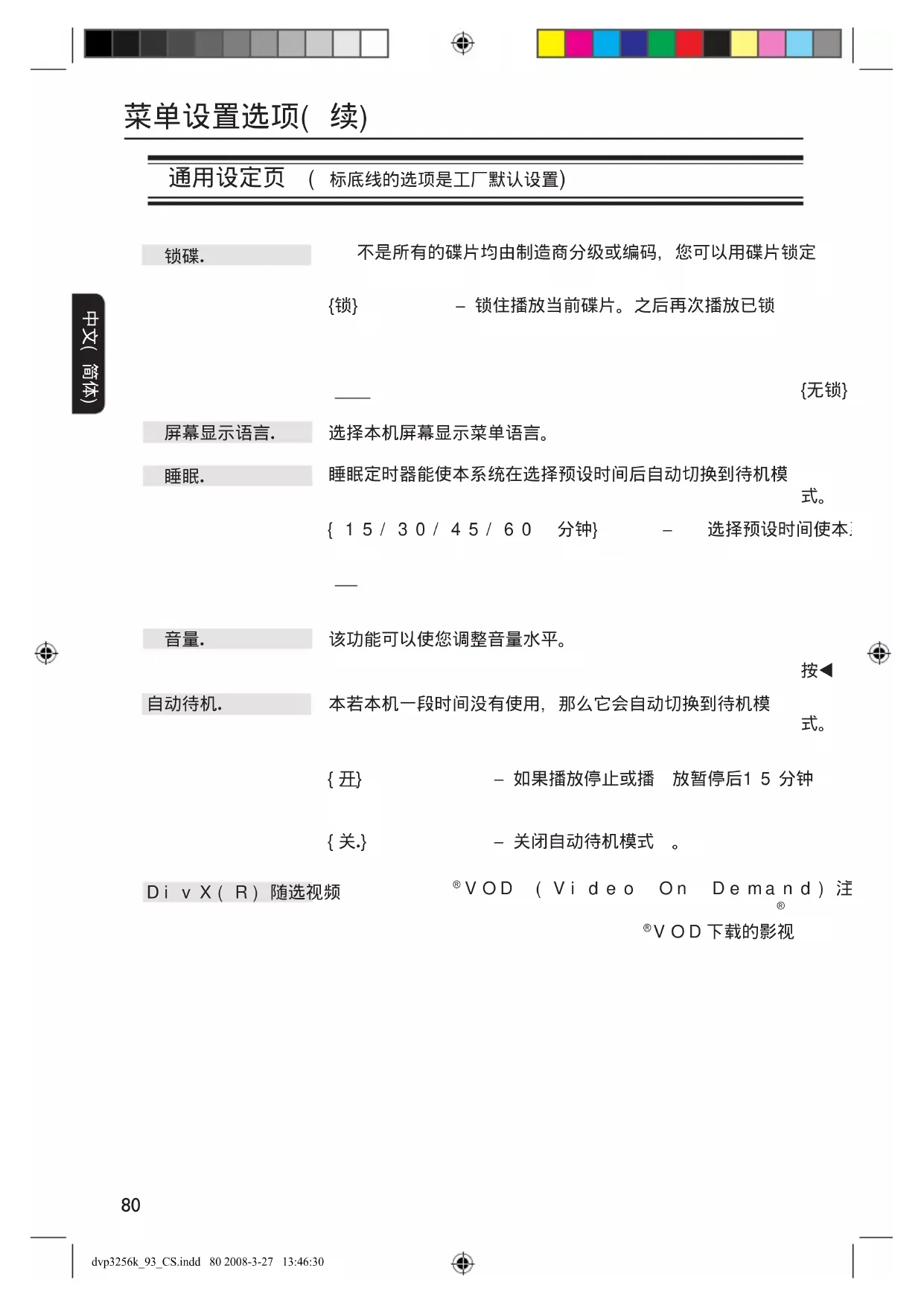 不是所有的碟片均由制造商分级或编码,您可以用碟片锁定 功能来禁止播放某些特殊碟片。最多可锁定20张碟片 。 {锁} – 锁住播放当前碟片。之后再次播放已锁 碟片则需要输入一个6位数密码。 默认的密码是’136900’, 参看 ‘通用设定页-密码’ 。 {无锁} – 可以播放任意碟片。 选择本机屏幕显示菜单语言。 睡眠定时器能使本系统在选择预设时间后自动切换到待机模 式。 {15/30/45/60 分钟} – 选择预设时间使本系统自动切换到 待机模式。 {关 } – 关闭睡眠模式。 该功能可以使您调整音量水平。 按 键在 0 ~ 20 间调节音量级别。 本若本机一段时间没有使用,那么它会自动切换到待机模 式。 { 开} – 如果播放停止或播 放暂停后15分钟 内不按任何按键,系统会自, 动切换到 低功耗待机模式。 { 关.} – 关闭自动待机模式 。 飞利浦提供 DivX VOD (Video On Demand)注册码, 这些编码可以使您从http://www.divx.com/vod. 网上的DivX