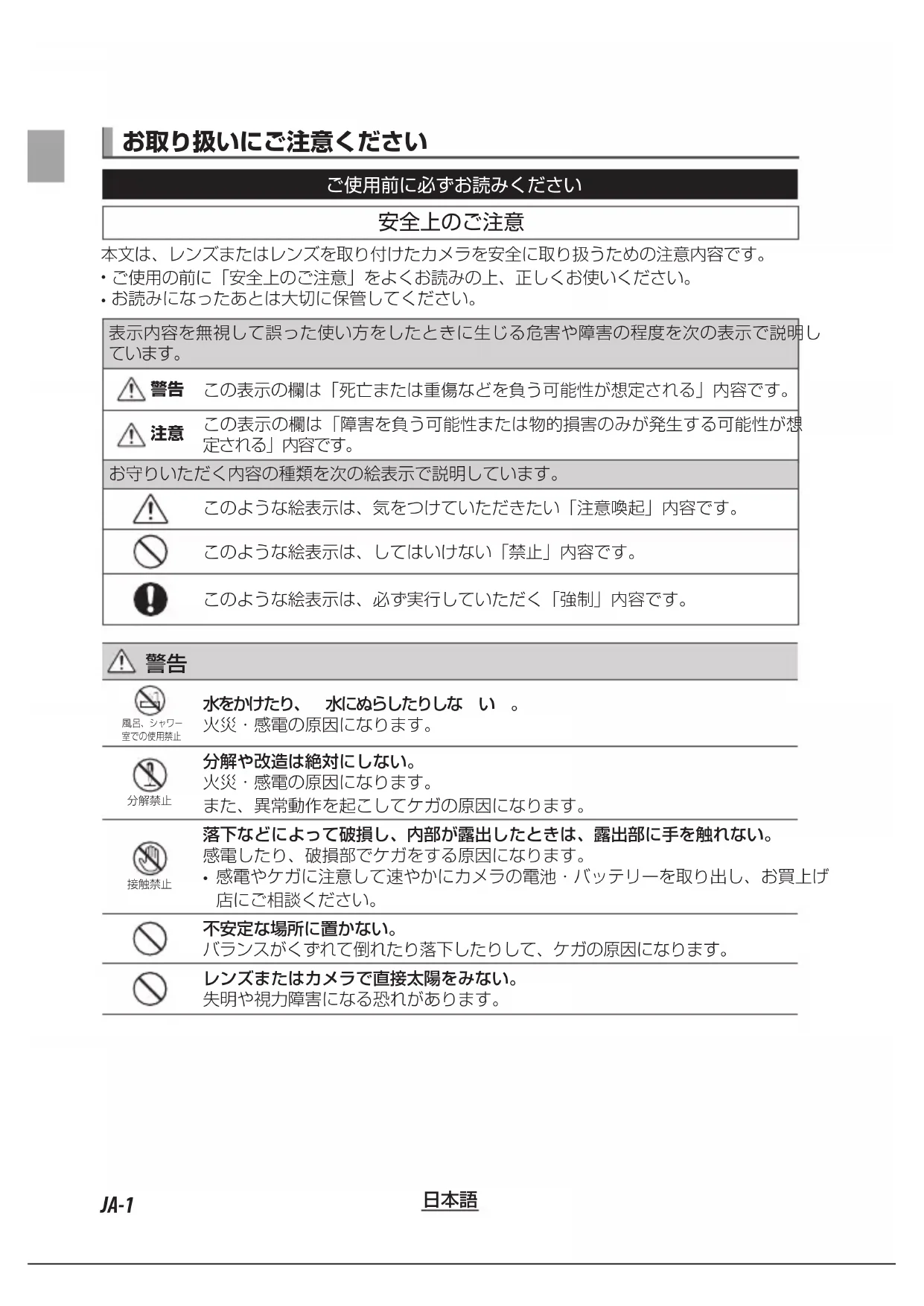 お取り扱いにご注意ください ご使用前に必ずお読みください 本文は、レンズまたはレンズを取り付けたカメラを安全に取り扱うための注意内容です。 ご使用の前に「安全上のご注意」をよくお読みの上、正しくお使いください。 お読みになったあとは大切に保管してください。表示内容を無視して誤った使い方をしたときに生じる危害や障害の程度を次の表示で説明しています。