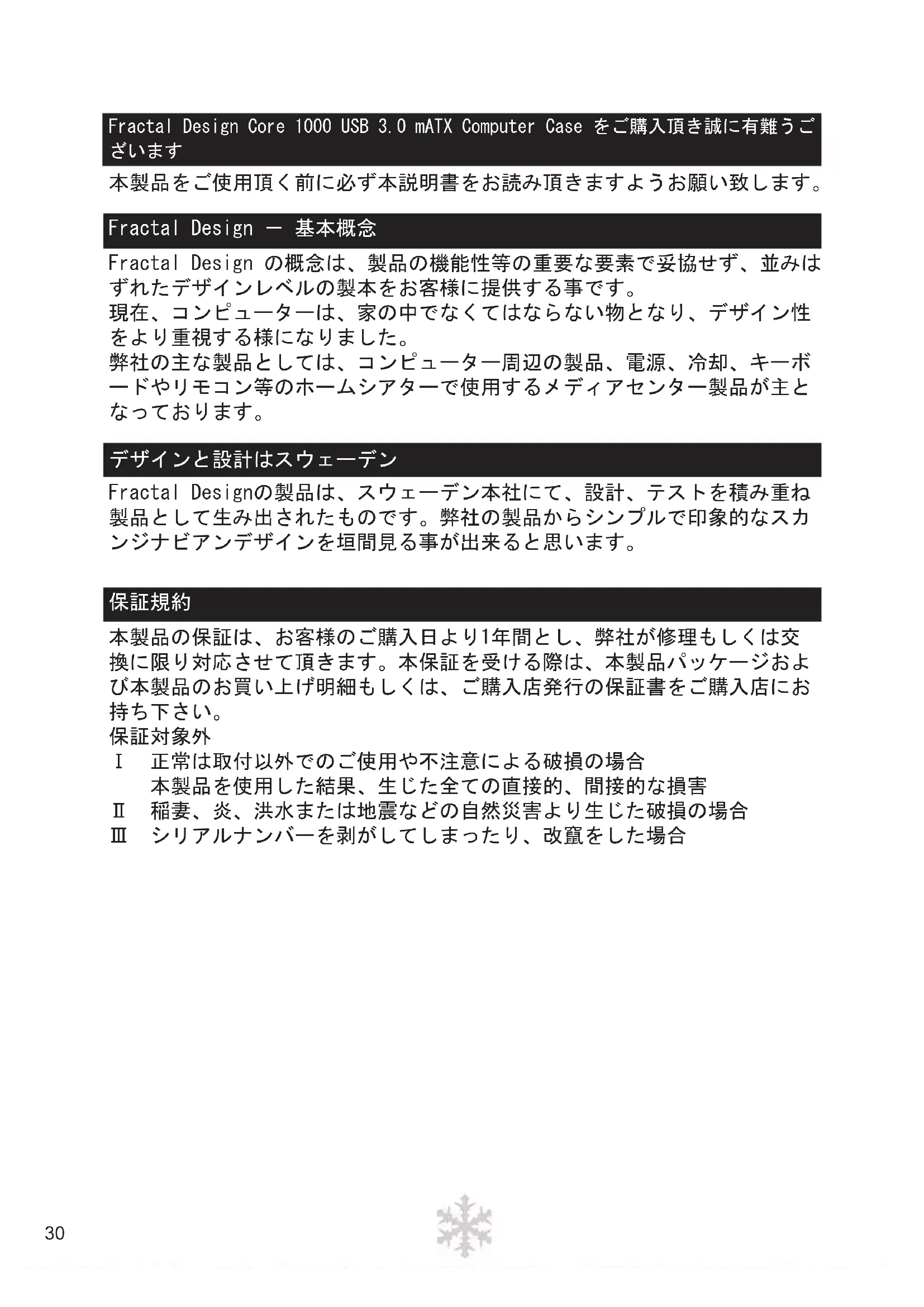 Ⅰ 正常は取付以外でのご使用や不注意による破損の場合 本製品を使用した結果、生じた全ての直接的、間接的な損害 Ⅱ 稲妻、炎、洪水または地震などの自然災害より生じた破損の場合 Ⅲ シリアルナンバーを剥がしてしまったり、改竄をした場合Core Series - 1000 USB 3.0 Fractal DesignのCore Seriesは、デザイン性、冷却性等を追求したケースで