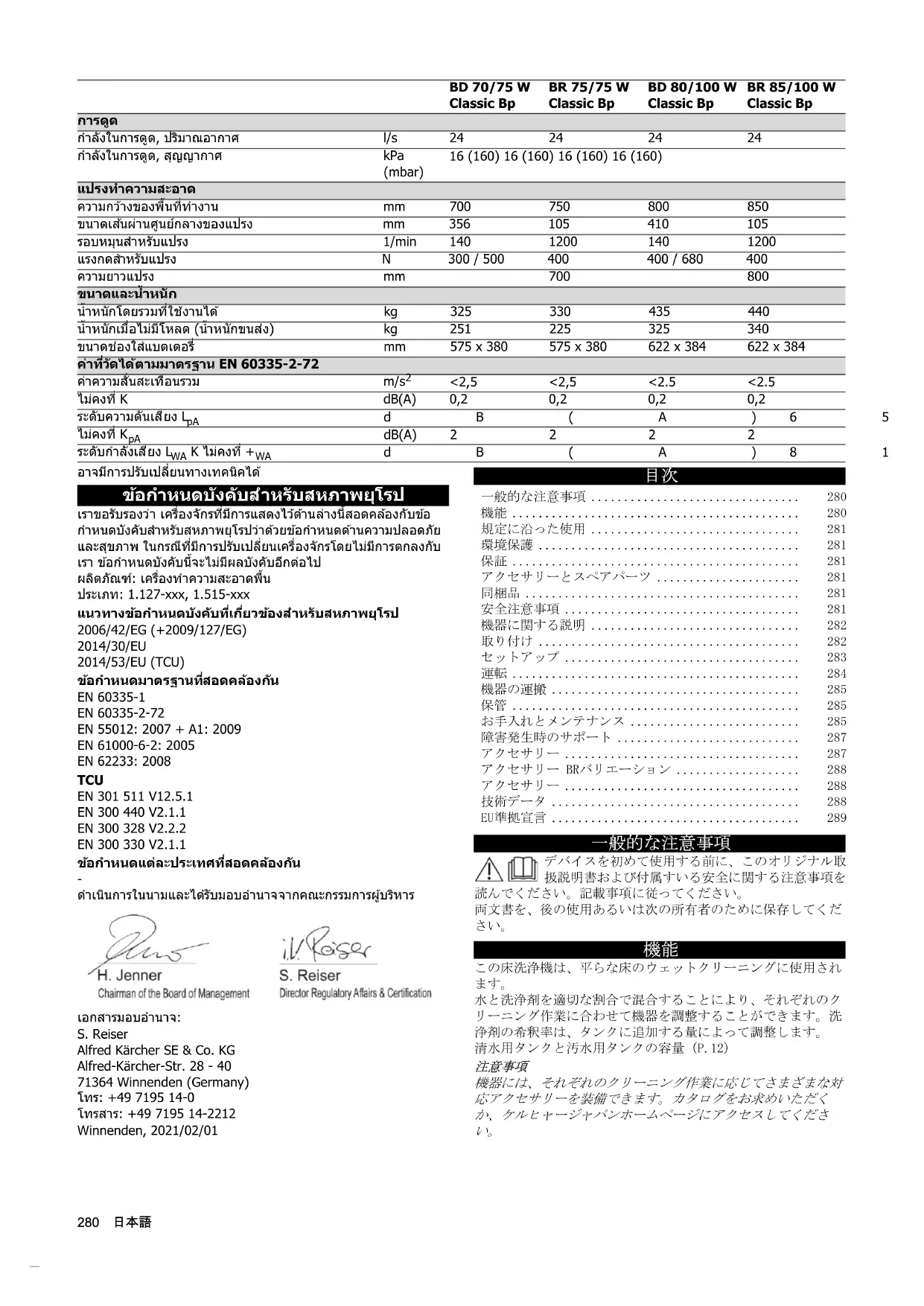 dB(A) 81 81 81 81日本語 289 EU準拠宣言 弊社はここに以下に記載する機械がその設計と製造型式および 弊社によって市場に出された仕様において、関連するEU指令 の安全要件および健康要件を満たしていることを宣言します。 弊社との相談なしに機械に改造を食うわえた場合は、この宣言 の有効性が失われます。 製品: フロアクリーナー 型式: 1.127-xxx, 1.515-xxx 関連するEU指令 2006/42/EG(+2009/127/EG) 2014/30/EU 2014/53/EU (TCU)