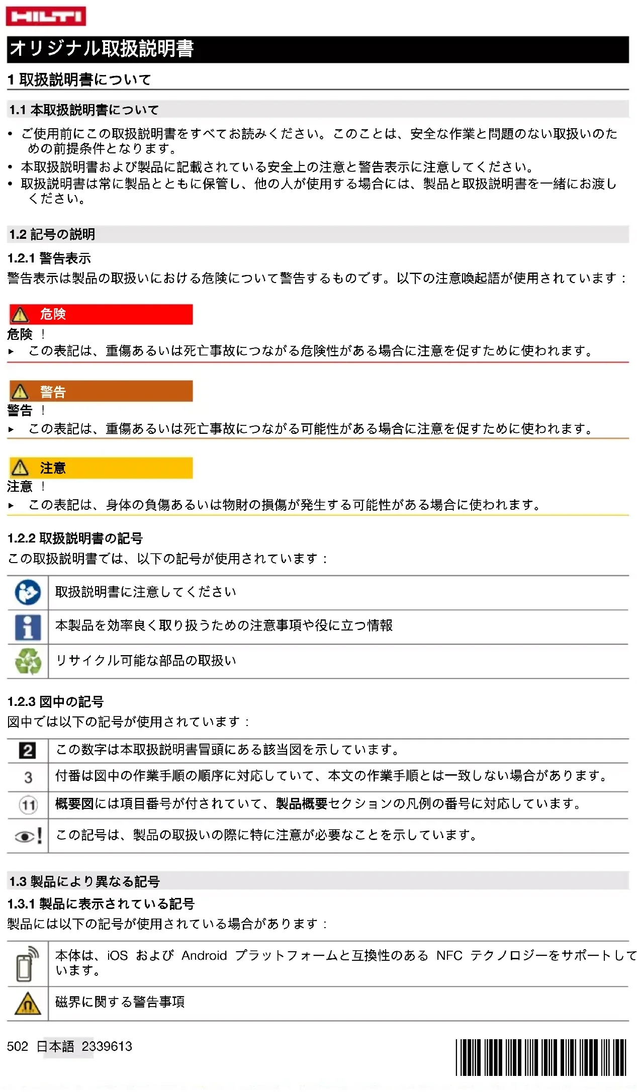 本製品を使用する前に毎回、正しく機能するか、摩耗および損傷がないか点検してください。本製品を 落下させた場合、あるいは損傷が認められる場合には使用を取り止め、Hilti サービスセンターにご連絡 ください。504 日本語 2339613 *2339613* ▶ 損傷を防止するため、本製品は熱源にさらさないようにしてください。所定の保管温度および動作温度