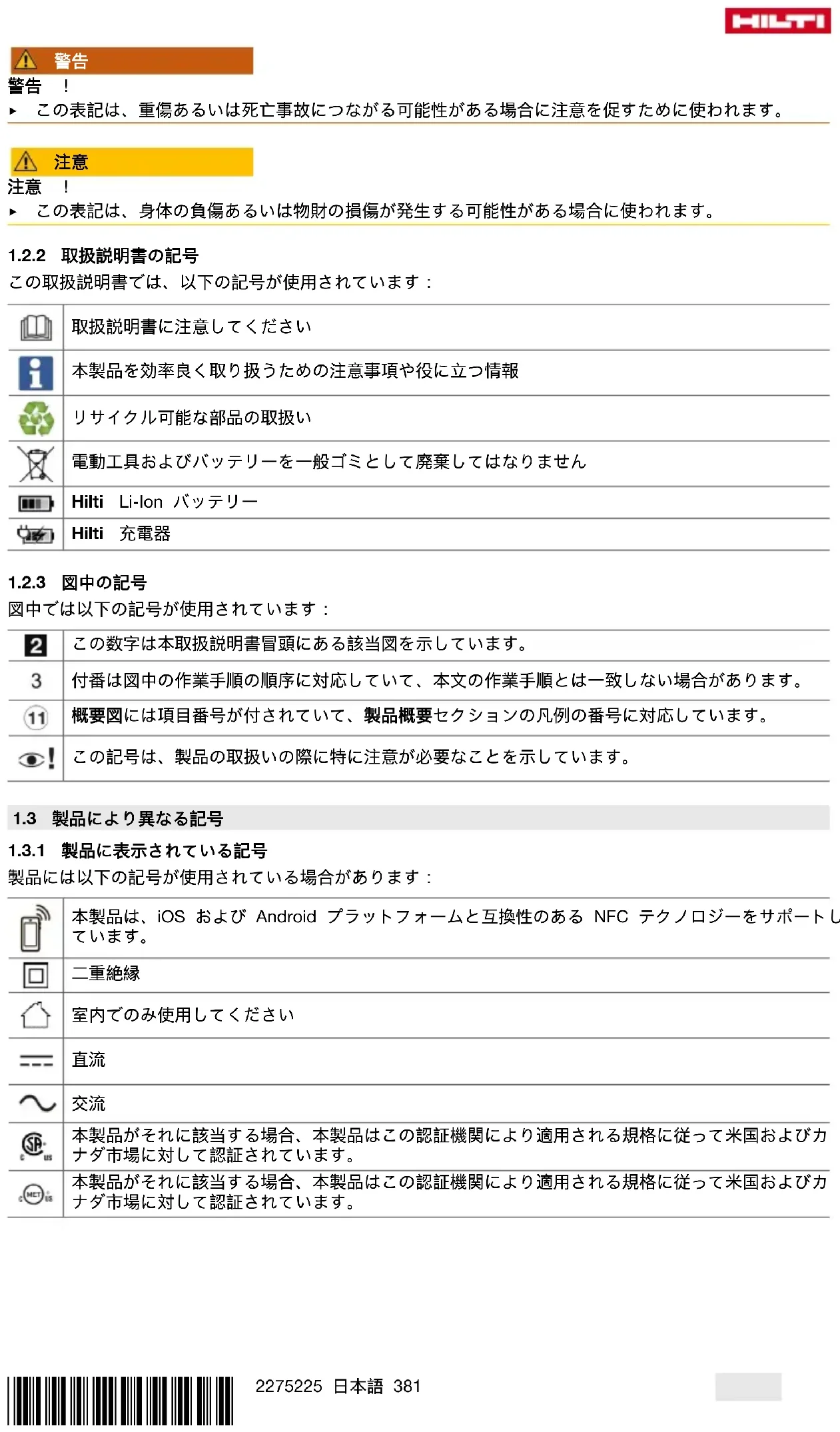 11 メーカー保証 ▶ 保証条件に関するご質問は、最寄りのHilti 代理店・販売店までお問い合わせください。388 日本語 2275225 *2275225* 12 その他の情報 C 6-22 (01) RoHS(有害物質使用制限に関するガイドライン) この表は中国市場に適用されるものです。*2275225* 2275225 日本語 389 この表は台湾市場に適用されるものです。 C 8-22 (01)390 日本語 2275225 *2275225* RoHS(有害物質使用制限に関するガイドライン) この表は中国市場に適用されるものです。*2275225* 2275225 日本語 391 この表は台湾市場に適用されるものです。 13 Hilti Li-Ion バッテリー 安全と用途に関する注意事項 本書において「バッテリー」という用語は、その内部に複数の結合されたリチウムイオンセルを収納してい る再充電が可能な Hilti 製 Li-Ion バッテリーを指します。バッテリーは Hilti 製電動工具専用で、それ以外の 用途には使用できません。必ず純正のHilti 製バッテリーを使用してください!
