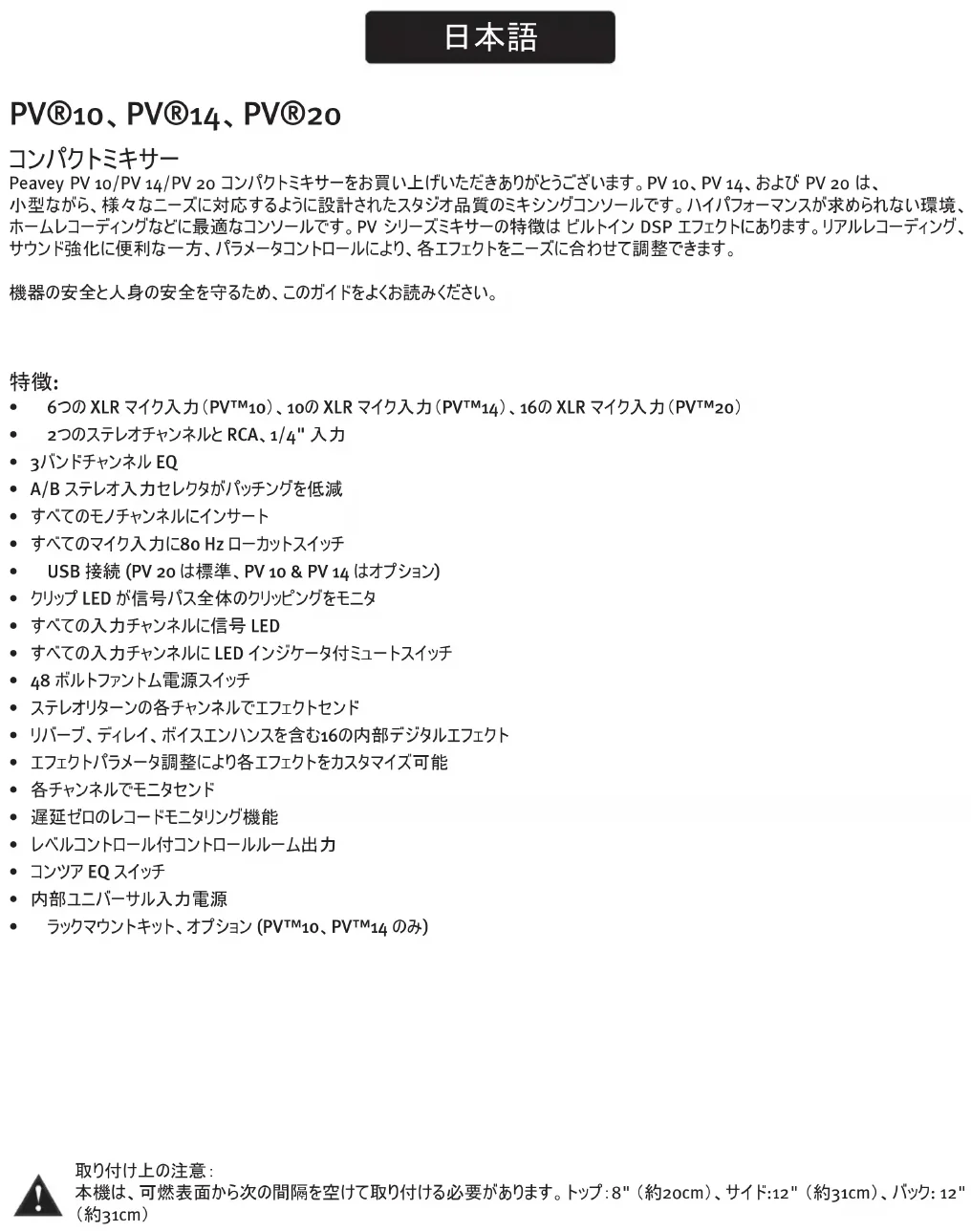 Peavey PV 10/PV 14/PV 20 コンパクトミキサーをお買い上げいただきありがとうございます。PV 10、PV 14、および PV 20 は、 小型ながら、様々なニーズに対応するように設計されたスタジオ品質のミキシングコンソールです。ハイパフォーマンスが求められない環境、 ホームレコーディングなどに最適なコンソールです。PV シリーズミキサーの特徴は ビルトイン DSP エフェクトにあります。リアルレコーディング、 サウンド強化に便利な一方、パラメータコントロールにより、各エフェクトをニーズに合わせて調整できます。 機器の安全と人身の安全を守るため、このガイドをよくお読みください。