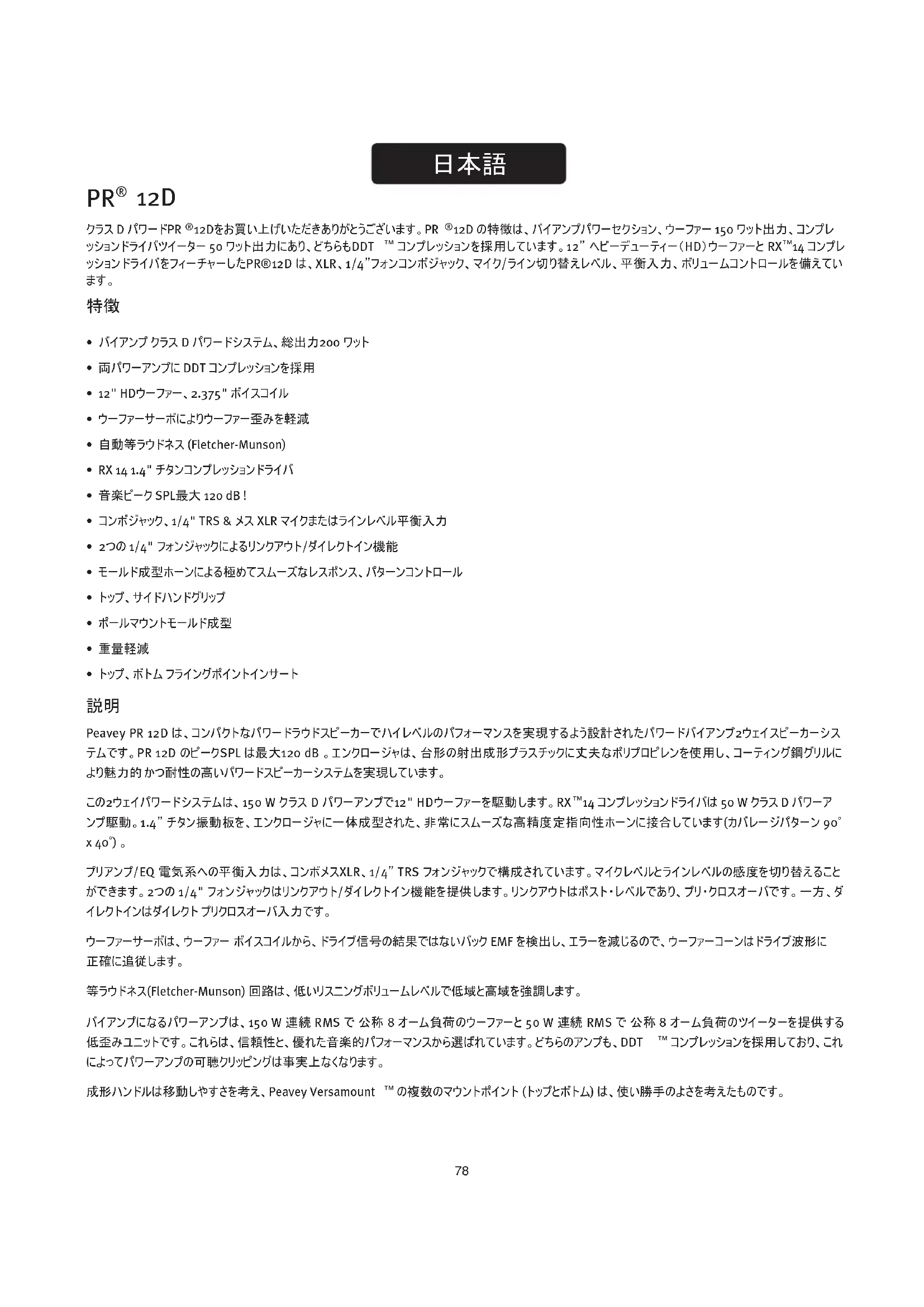 ッションドライバをフィーチャーしたPR®12D は、XLR、1/4”フォンコンボジャック、マイク/ライン切り替えレベル、平衡入力、ボリュームコントロールを備えてい