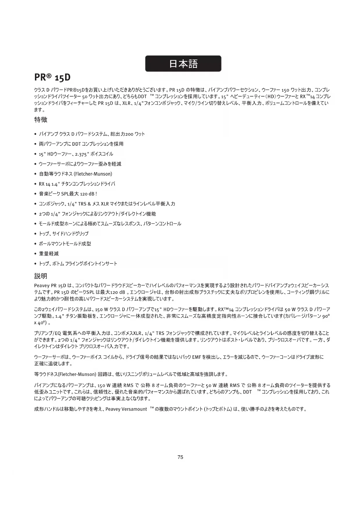 15D クラス D パワードPR®15Dをお買い上げいただきありがとうございます。PR 15D の特徴は、バイアンプパワーセクション、ウーファー 150 ワット出力、コンプレ ッションドライバツイーター 50 ワット出力にあり、どちらもDDT