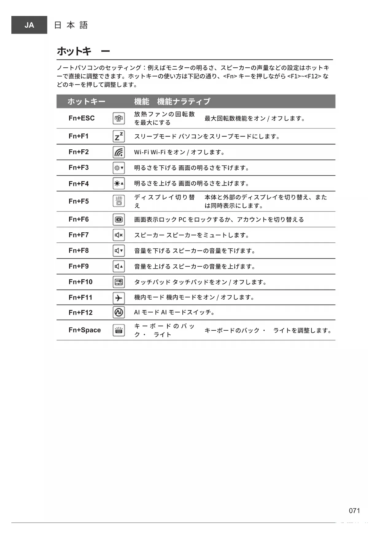 Fn+ESC放熱ファンの回転数を最大にする最大回転数機能をオン / オフします。Fn+F1スリープモード パソコンをスリープモードにします。Fn+F2Wi-Fi Wi-Fi をオン / オフします。Fn+F3明るさを下げる 画面の明るさを下げます。Fn+F4 明るさを上げる 画面の明るさを上げます。Fn+F5 ディスプレイ切り替 本体と外部のディスプレイを切り替え、または同時表示にします。Fn+F6 画面表示ロック PC をロックするか、アカウントを切り替えるFn+F7 スピーカー スピーカーをミュートします。Fn+F8 音量を下げる スピーカーの音量を下げます。Fn+F9 音量を上げる スピーカーの音量を上げます。Fn+F10 タッチパッド タッチパッドをオン / オフします。Fn+F11 機内モード 機内モードをオン / オフします。Fn+F12AI モード AI モードスイッチ。Fn+Spaceキーボードのバック ‧ ライトキーボードのバック ‧ ライトを調整します。JA