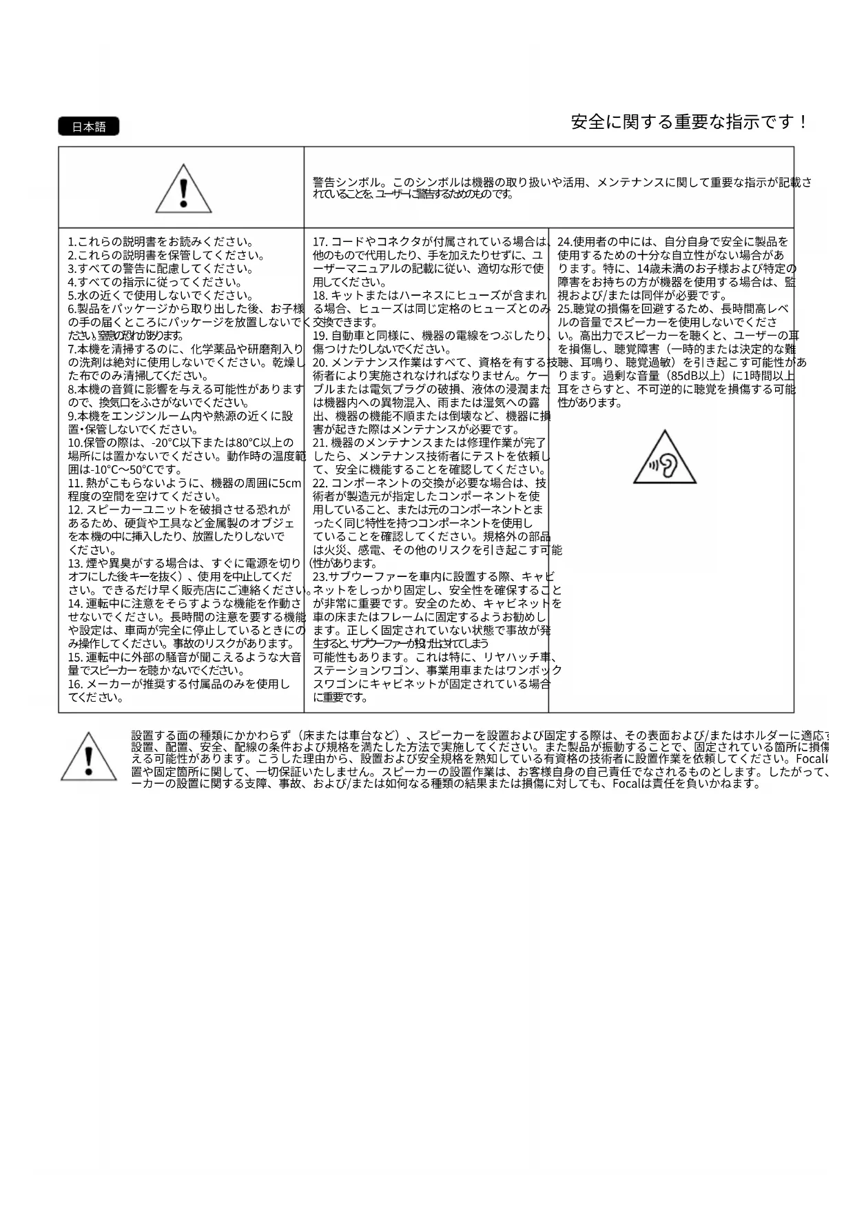 設置する面の種類にかかわらず(床または車台など)、スピーカーを設置および固定する際は、その表面および/またはホルダーに適応する 設置、配置、安全、配線の条件および規格を満たした方法で実施してください。また製品が振動することで、固定されている箇所に損傷を与 える可能性があります。こうした理由から、設置および安全規格を熟知している有資格の技術者に設置作業を依頼してください。Focalは設 置や固定箇所に関して、一切保証いたしません。スピーカーの設置作業は、お客様自身の自己責任でなされるものとします。したがって、スピ ーカーの設置に関する支障、事故、および/または如何なる種類の結果または損傷に対しても、Focalは責任を負いかねます。 警告シンボル。このシンボルは機器の取り扱いや活用、メンテナンスに関して重要な指示が記載さ れ て い る こ と を 、ユ ー ザ ー に 警 告 す る た め の も の で す 。 1.これらの説明書をお読みください。 2.これらの説明書を保管してください。 3.すべての警告に配慮してください。 4.すべての指示に従ってください。 5.水の近くで使用しないでください。 6.製品をパッケージから取り出した後、お子様 の手の届くところにパッケージを放置しないでく だ さ い 。窒 息 の 恐 れ が あ り ま す 。 7.本機を清掃するのに、化学薬品や研磨剤入り の洗剤は絶対に使用しないでください。乾燥し た 布で の み 清 掃してくだ さい 。 8.本機の音質に影響を与える可能性があります ので、換気口をふさがないでください。 9.本機をエンジンルーム内や熱源の近くに設 置・保 管 し な い でく だ さ い 。 10.保管の際は、-20℃以下または80℃以上の 場所には置かないでください。動作時の温度範 囲は-10℃~50℃です。