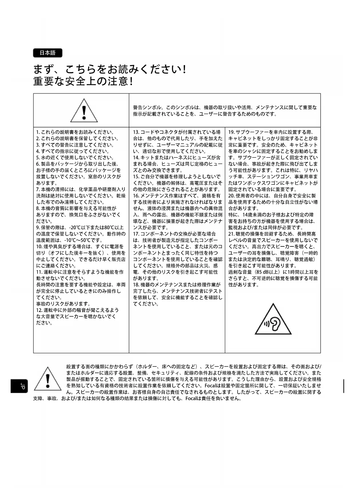 問題が発生した場合、Focal販売店までお問い合わせださい。 フランスにおけるFocal製品の法定保証期間は、ご購入日から2年です。製品に欠陥があった場合は購入時のパッケージ、まるいは運送中に製品 を完璧に保護できる、オリジナルのパッケージと同等の梱包で販売店へお送りください。販売店にて欠陥品を調べ、故障の原因を特定します。製 品が保証期間中であり、保証適用条件が揃っている場合、法的保証に関して製品購入日に適用されていた条件に応じて、修理または交換いたし ます。保証期間が終了している場合、修理にかかる見積もりをご連絡します。不適切な使用による故障または不正確な接続に起因する故障(例: ボイスコイルのオーバーヒートなど)は保証対象外です。条件は該当地域の現行法規に従い、各国のFocal正規販売代理店によりその地域で定 め ら れ 、施 行 さ れ て い ま す 。