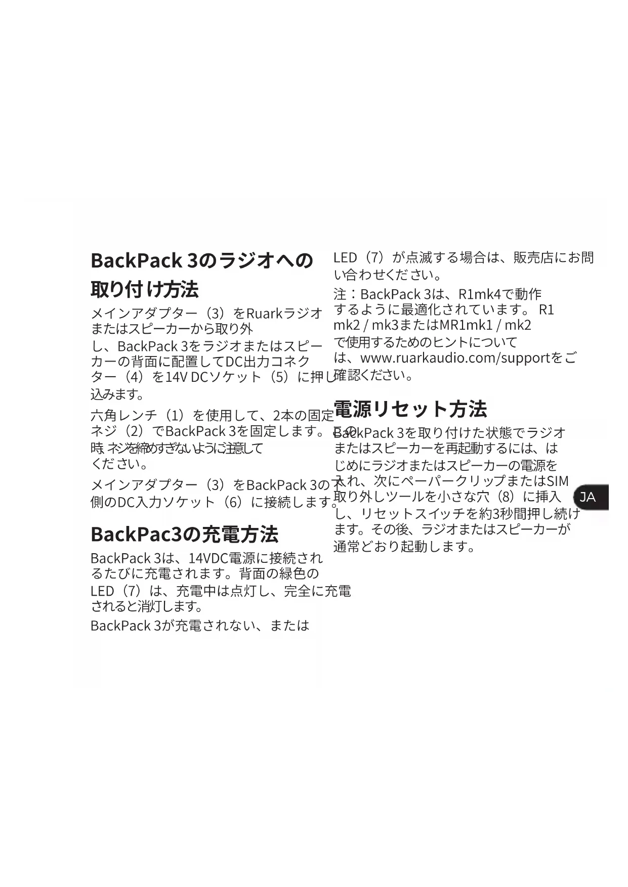 BackPack 3が充電されない、または LED(7)が点滅する場合は、販売店にお問 い合 わ せくだ さい 。 注:BackPack 3は、R1mk4で動作 するように最適化されています。 R1 mk2 / mk3またはMR1mk1 / mk2 で使用するためのヒントについて は、www.ruarkaudio.com/supportをご