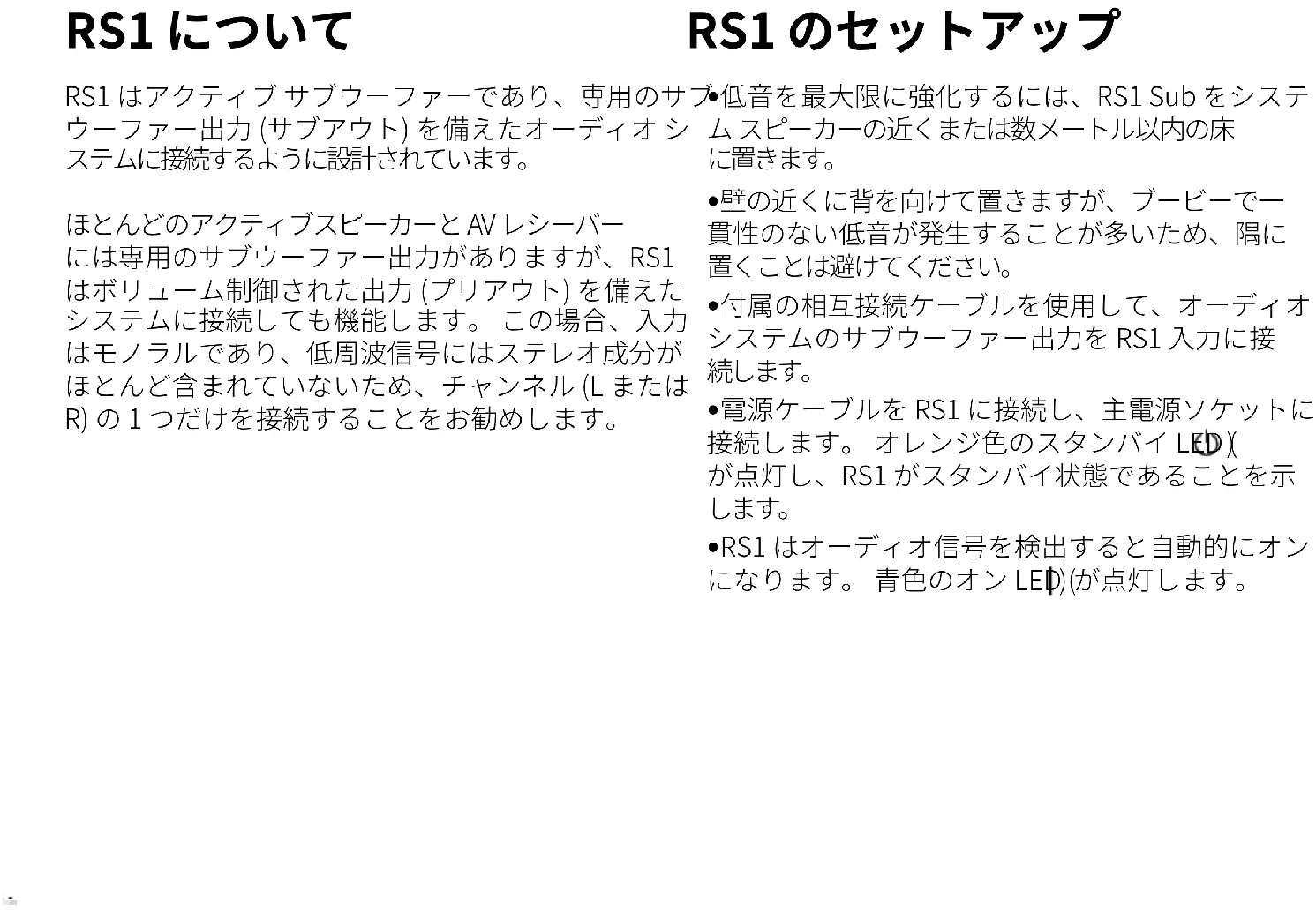 - RS1 Sub には自動スタンバイ機能があり、常に主電 源 AC コンセントに接続されるように設計されてい