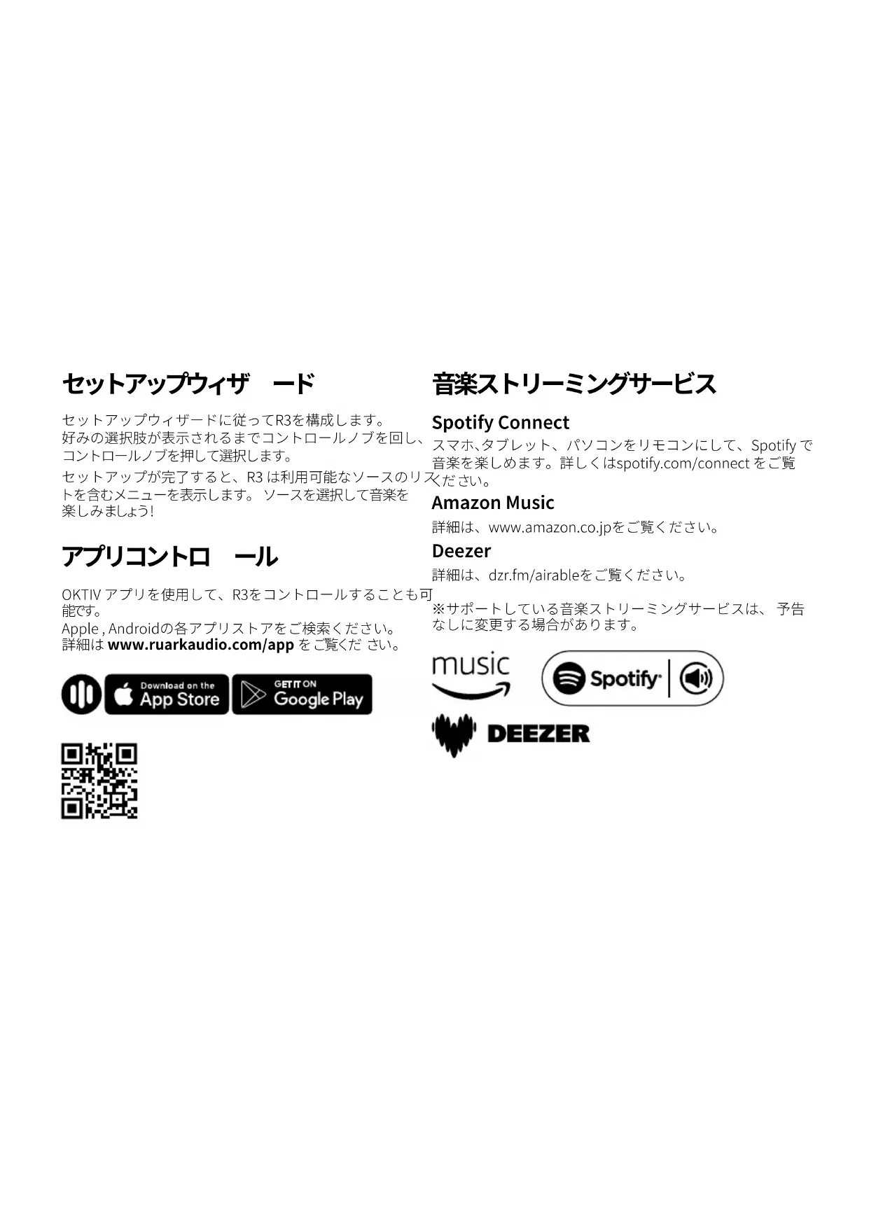Apple , Androidの各アプリストアをご検索ください。 詳細は www.ruarkaudio.com/app を ご覧くだ さい 。 音楽ストリーミングサービス Spotify Connect スマホ、タブレット、パソコンをリモコンにして、Spotify で 音楽を楽しめます。詳しくはspotify.com/connect をご覧