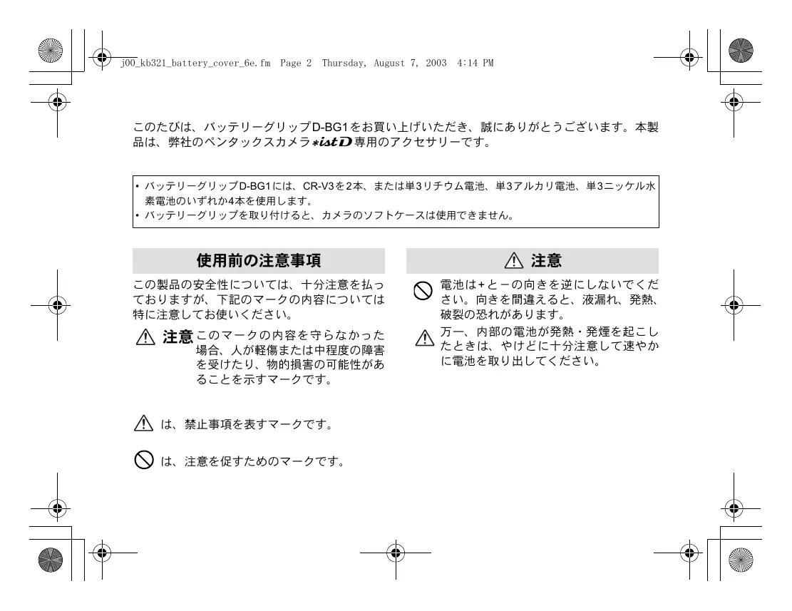 j00_kb321_battery_cover_6e.fm Page 1 Thursday, August 7, 2003 4:14 PM j00_kb321_battery_cover_6e.fm Page 2 Thursday, August 7, 2003 4:14 PM このたびは、バッテリーグリップ D-BG1 をお買い上げいただき、誠にありがとうございます。本製 品は、弊社のペンタックスカメラw専用のアクセサリーです。