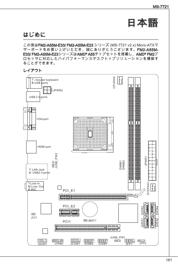 この度はFM2-A55M-E33/ FM2-A55M-E23 シリーズ (MS-7721 v2.x) Micro-ATXマ ザーボードをお買い上げいただき、誠にありがとうございます。FM2-A55ME33/ FM2-A55M-E23シリーズはAMD® A55チップセットを搭載し、AMD® FM2プ ロセッサに対応したハイパフォーマンスデスクトップソリューションを構築す