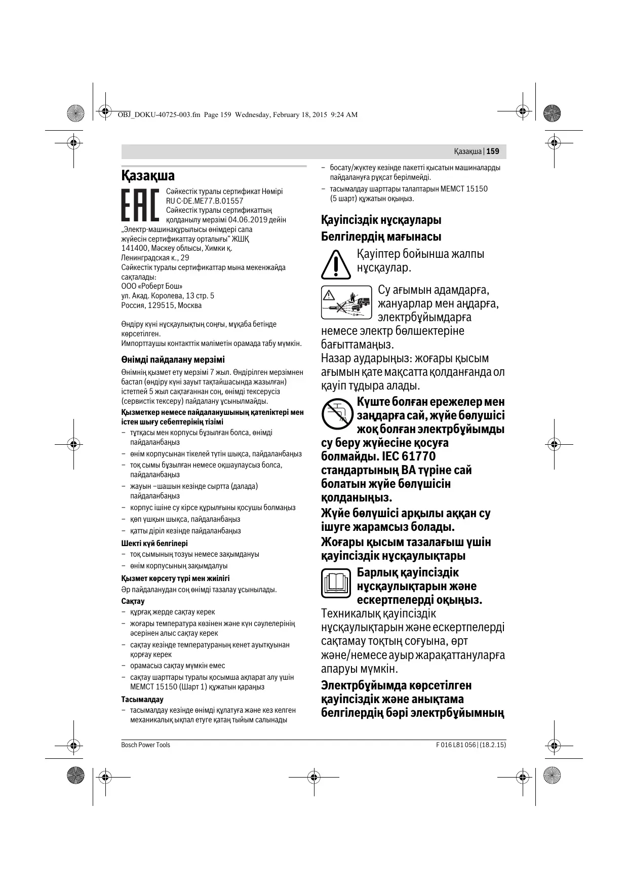 Очищувач високого тиску, приладдя і упаковку треба здавати на екологічно чисту повторну переробку. Не викидайте очищувачі високого тиску в побутове сміття! Лише для країн ЄС: Відповідно до європейської директиви 2012/19/EU про відпрацьовані електроі електронні прилади і її перетворення в національному законодавстві електро- і електронні прилади, що вийшли з використання повинні здаватися окремо і утилізуватися екологічно чистим Можливі зміни. F 016 L81 056 | (18.2.15) Bosch Power Tools OBJ_DOKU-40725-003.fm Page 159 Wednesday, February 18, 2015 9:24 AM Қазақша | 159 Қaзақша Сәйкестік туралы сертификат Нөмірi RU C-DE.ME77.B.01557 Сәйкестік туралы сертификаттың қолданылу мерзімі 04.06.2019 дейін „Электр-машинақұрылысы өнімдері сапа жүйесін сертификаттау орталығы“ ЖШҚ 141400, Мәскеу облысы, Химки қ. Ленинградская к., 29 Сәйкестік туралы сертификаттар мына мекенжайда ООО «Роберт Бош» ул. Акад. Королева, 13 стр. 5 Россия, 129515, Москва Өндіру күні нұсқаулықтың соңғы, мұқаба бетінде көрсетілген. Импорттаушы контакттік мәліметін орамада табу мүмкін. Өнімді пайдалану мерзімі Өнімнің қызмет ету мерзімі 7 жыл. Өндірілген мерзімнен бастап (өндіру күні зауыт тақтайшасында жазылған) істетпей 5 жыл сақтағаннан соң, өнімді тексерусіз (сервистік тексеру) пайдалану ұсынылмайды. Қызметкер немесе пайдаланушының қателіктері мен істен шығу себептерінің тізімі – тұтқасы мен корпусы бұзылған болса, өнімді пайдаланбаңыз – өнім корпусынан тікелей түтін шықса, пайдаланбаңыз – тоқ сымы бұзылған немесе оқшаулаусыз болса, пайдаланбаңыз – жауын –шашын кезінде сыртта (далада) пайдаланбаңыз – корпус ішіне су кірсе құрылғыны қосушы болмаңыз – қөп үшқын шықса, пайдаланбаңыз – қатты діріл кезінде пайдаланбаңыз Шекті күй белгілері – тоқ сымының тозуы немесе зақымдануы – өнім корпусының зақымдалуы Қызмет көрсету түрі мен жиілігі Әр пайдаланудан соң өнімді тазалау ұсынылады. – құрғақ жерде сақтау керек – жоғары температура көзінен және күн сәулелерінің әсерінен алыс сақтау керек – сақтау кезінде температураның кенет ауытқуынан қорғау керек – орамасыз сақтау мүмкін емес – сақтау шарттары туралы қосымша ақпарат алу үшін МЕМСТ 15150 (Шарт 1) құжатын қараңыз – тасымалдау кезінде өнімді құлатуға және кез келген механикалық ықпал етуге қатаң тыйым салынады Bosch Power Tools – босату/жүктеу кезінде пакетті қысатын машиналарды пайдалануға рұқсат берілмейді. – тасымалдау шарттары талаптарын МЕМСТ 15150 (5 шарт) құжатын оқыңыз. Қауіпсіздік нұсқаулары Белгілердің мағынасы Қауіптер бойынша жалпы Су ағымын адамдарға, жануарлар мен аңдарға, электрбұйымдарға немесе электр бөлшектеріне бағыттамаңыз. Назар аударыңыз: жоғары қысым ағымын қате мақсатта қолданғанда ол қауіп тұдыра алады. Күште болған ережелер мен заңдарға сай, жүйе бөлушісі жоқ болған электрбұйымды су беру жүйесіне қосуға болмайды. IEC 61770 стандартының ВА түріне сай болатын жүйе бөлүшісін қолданыңыз. Жүйе бөлүшісі арқылы аққан су ішуге жарамсыз болады. Жоғары қысым тазалағыш үшін қауіпсіздік нұсқаулықтары Барлық қауіпсіздік нұсқаулықтарын және ескертпелерді оқыңыз. Техникалық қауіпсіздік нұсқаулықтарын және ескертпелерді сақтамау тоқтың соғуына, өрт және/немесе ауыр жарақаттануларға апаруы мүмкін. Электрбұйымда көрсетілген қауіпсіздік және анықтама белгілердің бәрі электрбұйымның F 016 L81 056 | (18.2.15) OBJ_DOKU-40725-003.fm Page 160 Wednesday, February 18, 2015 9:24 AM 160 | Қазақша қауіпсіз түрде жұм