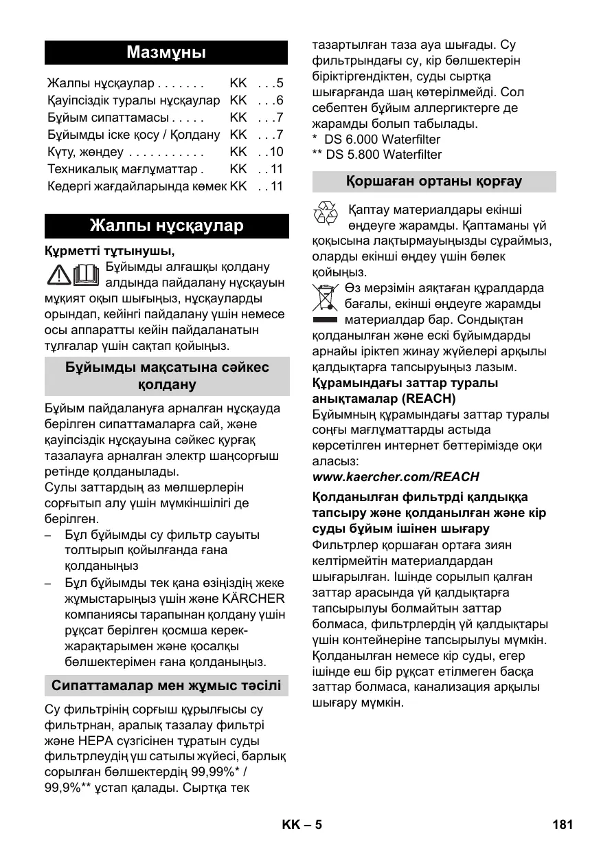 DS 5.800 WATEFILTER - Су мен шаңсорғыш KARCHER - Тегін пайдаланушы нұсқаулығы