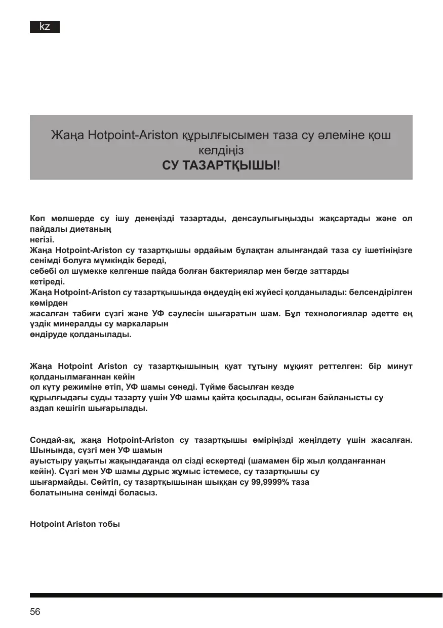 қолдануға рұқсат бермеңіз. Су ағызып жатқан кезде құрылғыны бақылаусыз қалдырушы болмаңыз. Салқын су алу үшін суға толы ыдысты тоңазытқышта сақтауға болады. Ыдысты асыра толтыруға және ыдыста су деңгейі минималды белгіден төмен кезде қолдануға болмайды: су деңгейі аз болған кезде қолданылса, сорғы ауа сорып, бұрқылдаған дыбыстар шығатын болады. Құрылғыны жөндеу және оған қызмет көрсету үшін тек өндірушінің түпнұсқа бөлшектерін пайдаланыңыз. Құрылғыда тек Hotpoint-Ariston [Hotpoint] УФ шамдары мен сүзгілерін қолданыңыз, әйтпесе кепілдік күшін жояды. Құрылғы 3 сағат бойы қолданылмаса, УФ шамы 60 секундқа қосылады Құрылғыны тегіс, түзу, құрғақ әрі қауіпсіз жерге орналастырыңыз.