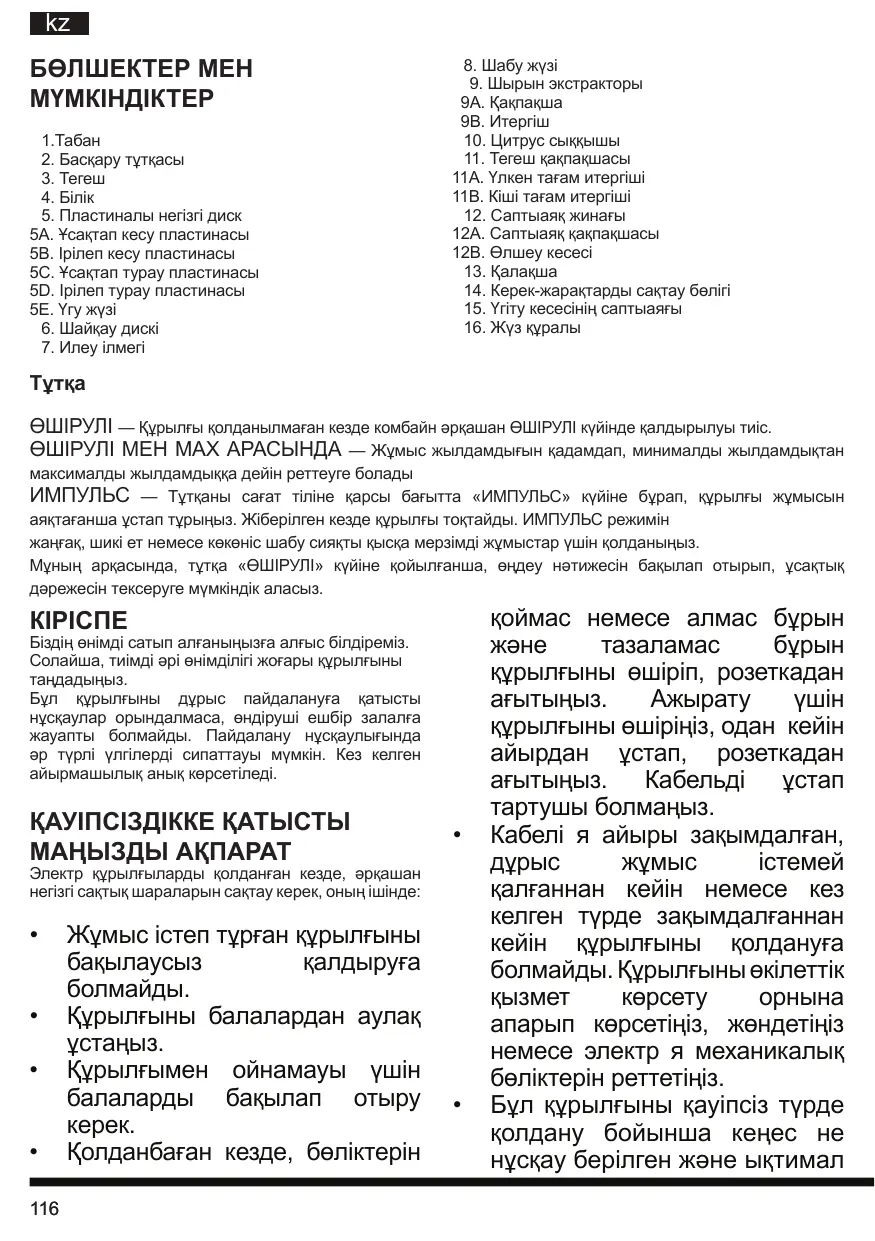 комбайнның зақымдалуына жол бермеу үшін, тағам өңделіп жатқан кезде қолдарыңызды және ас үй құралдарын қозғалмалы жүздерден немесе дискілерден аулақ ұстаңыз. Қырғышты қолдануға болады, бірақ асүйлік комбайн өшіп тұруы керек. Жарақат алмау үшін тегешті дұрыстап орнына қоймай тұрып, шабу жүзі мен кесу/турау дискін табанға орналастырушы болмаңыз. Қақпақты ашпас бұрын қозғалтқыш, диск және/ немесе шабу жүзі толығымен тоқтағанына көз жеткізіңіз. Құрылғыны қолданбас бұрын қақпақ орнына мықтап бекітілгеніне көз жеткізіңіз. Тағамды науаға қолмен салушы болмаңыз. Әрқашан тағам итергішін қолданыңыз. Бұл құрылғыны жарылғыш және/немесе тұтанғыш түтіндер болған кезде қолдануға Қақпақтың құлыптау механизміне кедергі жасауға әрекеттенбеңіз. Ток соғу қаупін азайту үшін астыңғы қақпақты алып тастауға әрекеттенбеңіз. Құрылғы ішінде пайдаланушы жөндей алатын бөлшектер жоқ. Жөндеу жұмыстарын тек өкілеттік мамандар атқаруы тиіс. Қауіпсіздігіңізді қамтамасыз ету үшін құрылғы құлыптау жүйесімен жабдықталған. Тегеш табанға бекітіліп, қақпақ тегешке дұрыстап құлыпталмағанша қосылмайды. Тегеш қақпақшасындағы үлкен таған итергіші де құлыпталған күйде екеніне көз жеткізіңіз. Тегеш қақпақшасы, тегеш және үлкен тағам итергіші дұрыстап орнына орналаспаған болса, құрылғыны қолдануға әрекеттенбеңіз. Өңдеуді бастамас бұрын табан тегіс, құрғақ әрі таза жерге тұрғанына көз жеткізіңіз.