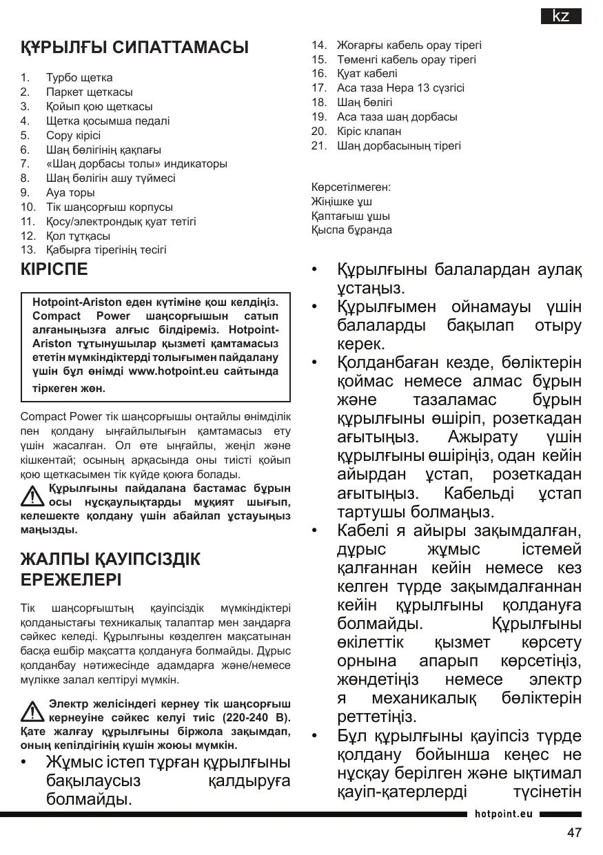 Hotpoint-Ariston еден күтіміне қош келдіңіз. Compact Power шаңсорғышын сатып алғаныңызға алғыс білдіреміз. HotpointAriston тұтынушылар қызметі қамтамасыз ететін мүмкіндіктерді толығымен пайдалану үшін бұл өнімді www.hotpoint.eu сайтында тіркеген жөн. Compact Power тік шаңсорғышы оңтайлы өнімділік пен қолдану ыңғайлылығын қамтамасыз ету үшін жасалған. Ол өте ыңғайлы, жеңіл және кішкентай; осының арқасында оны тиісті қойып қою щеткасымен тік күйде қоюға болады. Құрылғыны пайдалана бастамас бұрын осы нұсқаулықтарды мұқият шығып, келешекте қолдану үшін абайлап ұстауыңыз