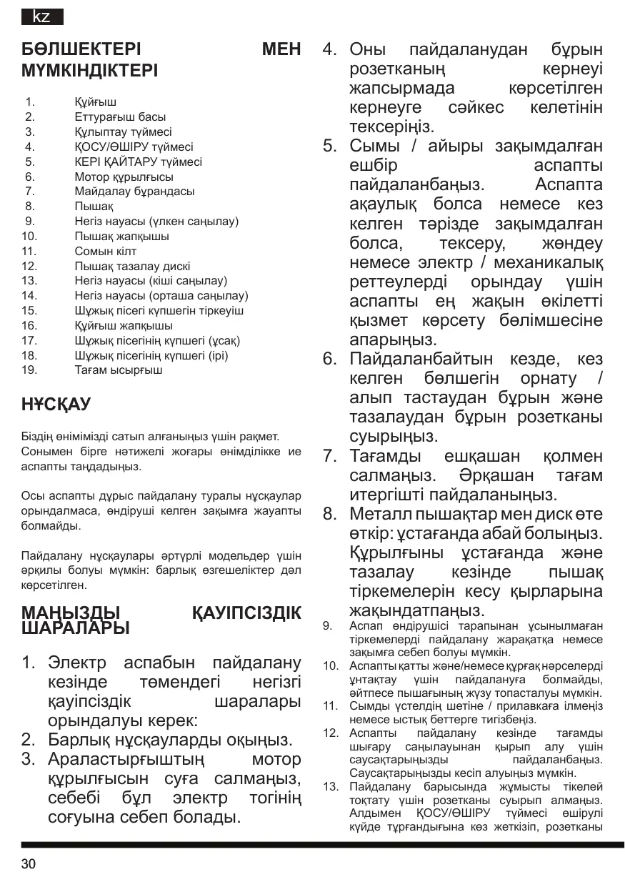 ПАЙДАЛАНУ НҰСҚАУЛАРЫ Ескертпе: Алғаш рет пайдаланудан бұрын тағам ысырғыш, құйғыш, басы, пышақ науасы (үлкен саңылаулы, орташа саңылаулы, кіші саңылаулы), пышақ жапқышы, пышақ, ірі бөлшектеу шұңқыры, ірі пішімдегіші т.б. сияқты барлық алынбалы бөлшектерді толық тазалаңыз. Пышақ өткір, абайлап ұстаңыз.