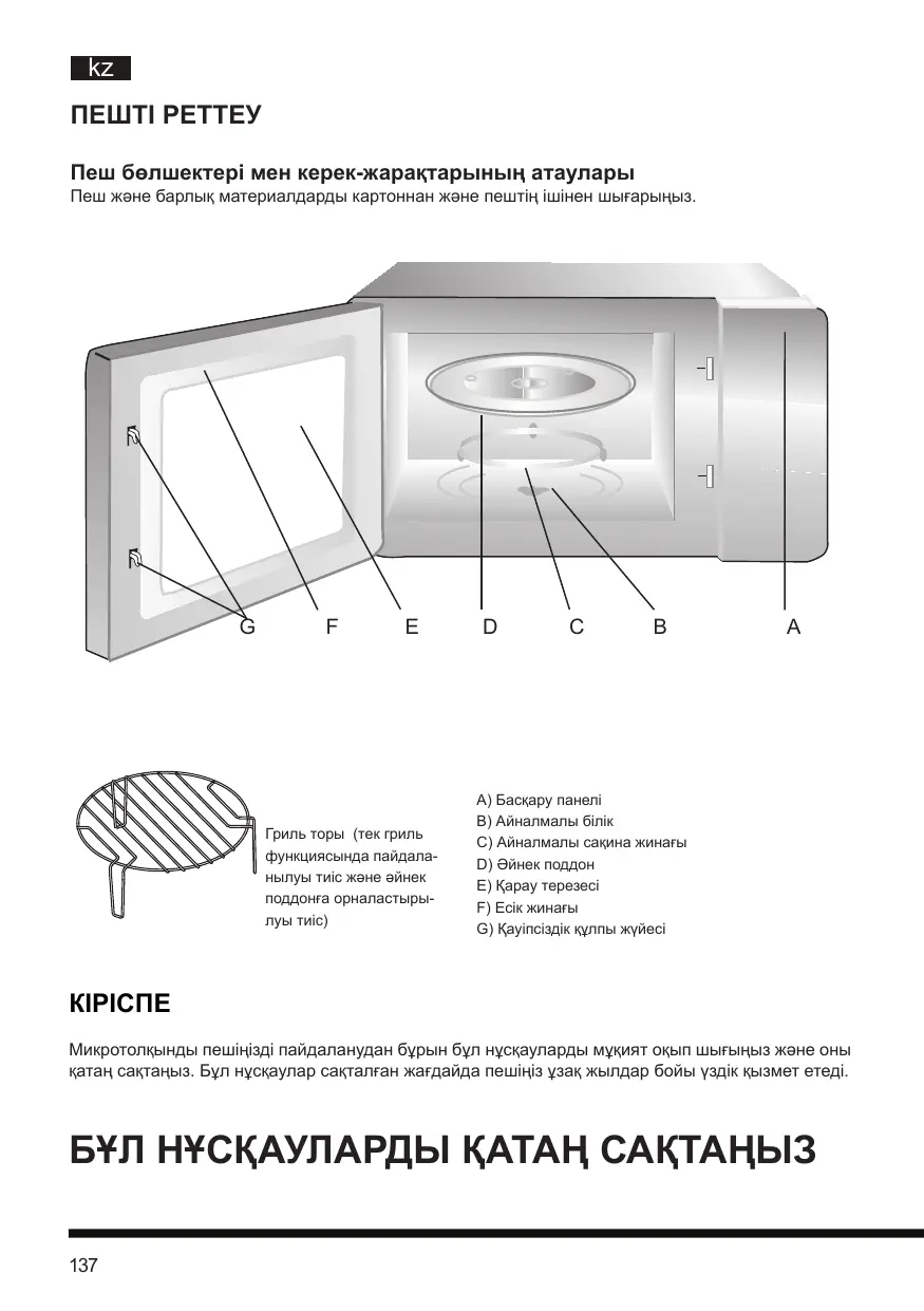 КІРІСПЕ Микротолқынды пешіңізді пайдаланудан бұрын бұл нұсқауларды мұқият оқып шығыңыз және оны қатаң сақтаңыз. Бұл нұсқаулар сақталған жағдайда пешіңіз ұзақ жылдар бойы үздік қызмет етеді.