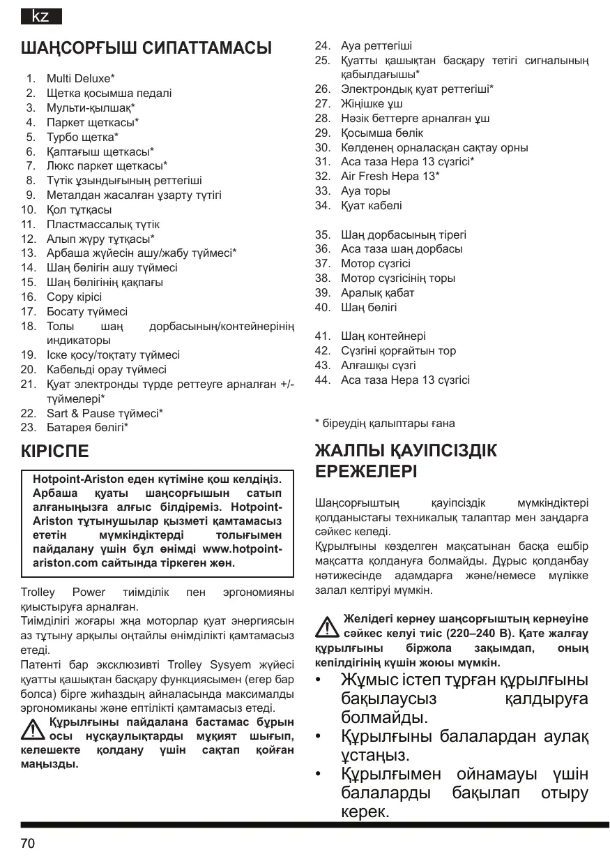 Hotpoint-Ariston еден күтіміне қош келдіңіз. Арбаша қуаты шаңсорғышын сатып алғаныңызға алғыс білдіреміз. HotpointAriston тұтынушылар қызметі қамтамасыз мүмкіндіктерді пайдалану үшін бұл өнімді www.hotpointariston.com сайтында тіркеген жөн. Trolley Power