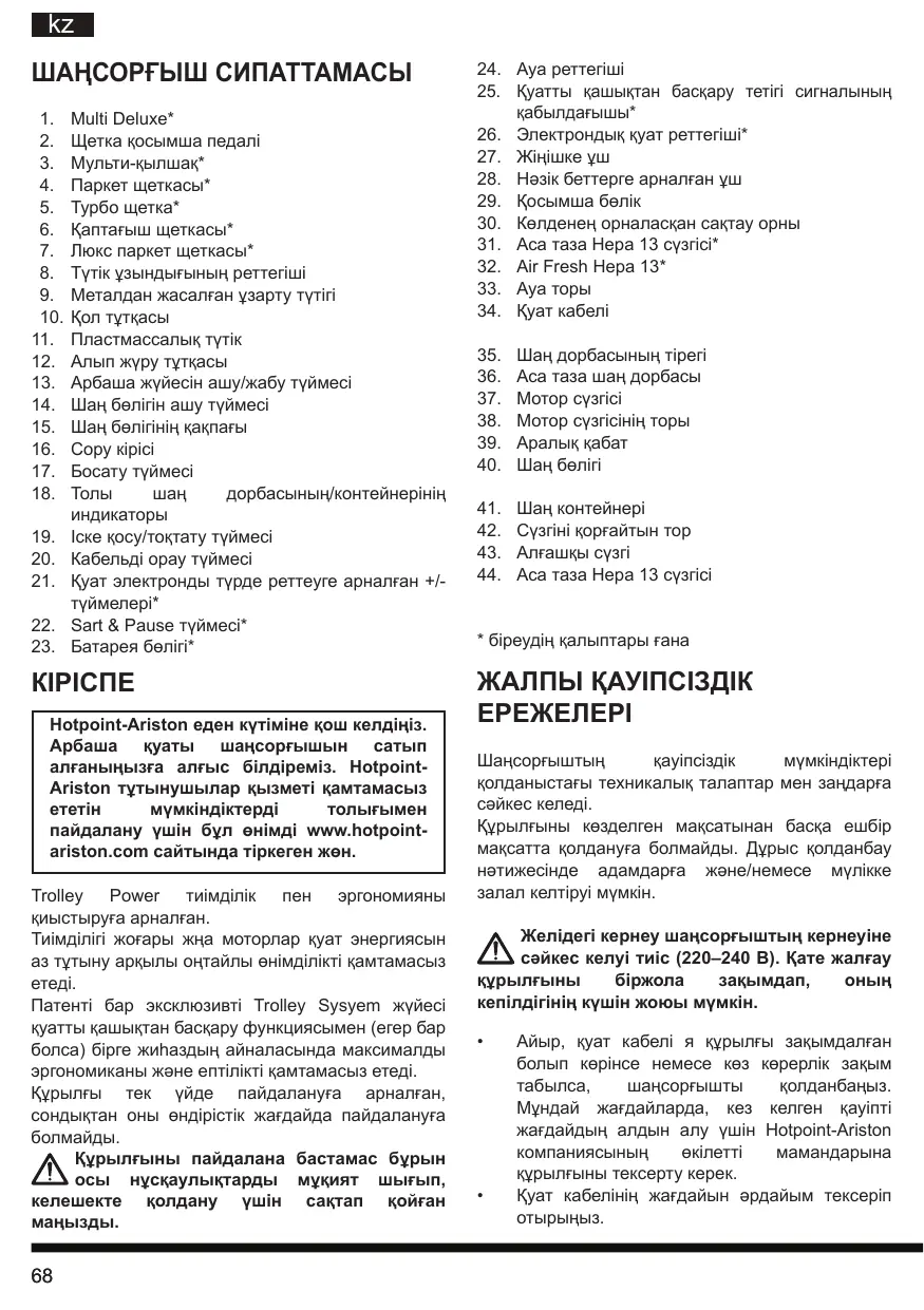 Hotpoint-Ariston еден күтіміне қош келдіңіз. Арбаша қуаты шаңсорғышын сатып алғаныңызға алғыс білдіреміз. HotpointAriston тұтынушылар қызметі қамтамасыз мүмкіндіктерді пайдалану үшін бұл өнімді www.hotpointariston.com сайтында тіркеген жөн. Trolley Power