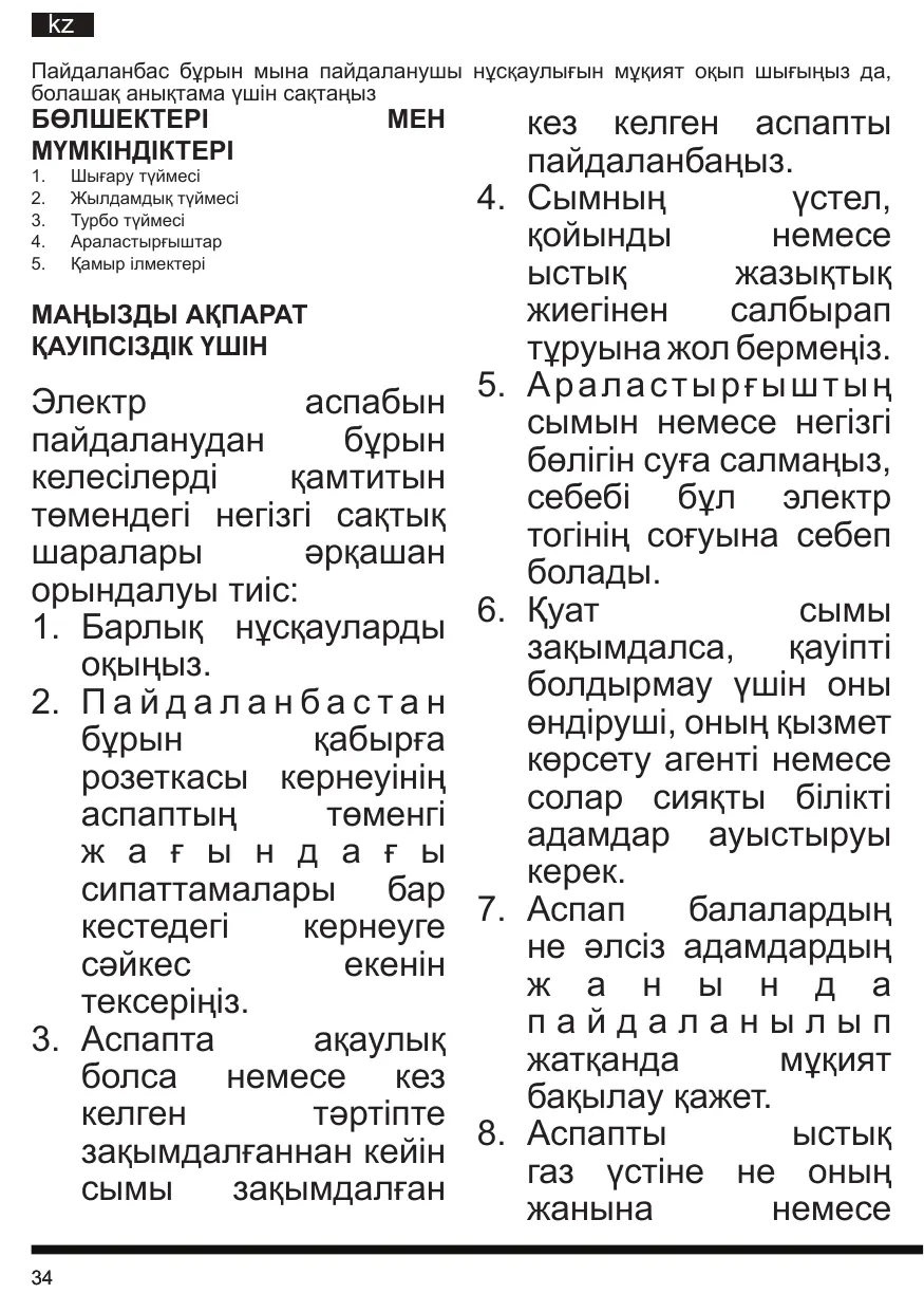Электр аспабын пайдаланудан бұрын келесілерді қамтитын төмендегі негізгі сақтық шаралары әрқашан орындалуы тиіс: 1. Барлық нұсқауларды оқыңыз. 2. П а й д а л а н б а с т а н бұрын қабырға розеткасы кернеуінің аспаптың төменгі ж а ғ ы н д а ғ ы сипаттамалары бар кестедегі кернеуге сәйкес екенін тексеріңіз. 3. Аспапта ақаулық болса немесе кез келген тәртіпте зақымдалғаннан кейін сымы зақымдалған 34