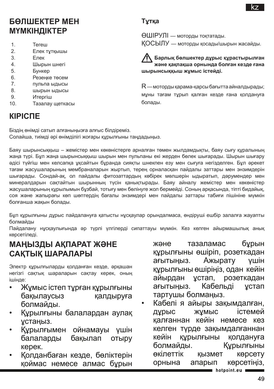 КІРІСПЕ Біздің өнімді сатып алғаныңызға алғыс білдіреміз. Солайша, тиімді әрі өнімділігі жоғары құрылғыны таңдадыңыз. Баяу шырынсыққыш – жемістер мен көкөністерге арналған төмен жылдамдықты, баяу сығу құралының жаңа түрі. Бұл жаңа шырынсыққыш шырын мен пульпаны екі жерден бөлек шығарады. Шырын шығару әдісі түйгіш мен келсапқа ұқсайтын бұранда сияқты шнекпен езу мен сығуға негізделген. Бұл әрекет тағам жасушаларының мембраналарын жыртып, терең орналасқан пайдалы заттары мен энзимдерін шығарады. Сондай-ақ, ол пайдалы фитозаттардың көбірек мөлшерін ыдыратып, дәрумендер мен минералдарын сақтайтын шырынның түсін қанықтырады. Баяу айналу жемістер мен көкөністер жасушаларының құрылымын бұзбай, тотығу мен бөлінуге жол бермейді. Соның арқасында, тіпті бидайық, соя және жапырағы көп шөптердің бағалы энзимдері мен пайдалы заттары табиғи пішініне мүмкін болғанша жақын болады. Бұл құрылғыны дұрыс пайдалануға қатысты нұсқаулар орындалмаса, өндіруші ешбір залалға жауапты болмайды Пайдалану нұсқаулығында әр түрлі үлгілерді сипаттауы мүмкін. Кез келген айырмашылық анық көрсетіледі.