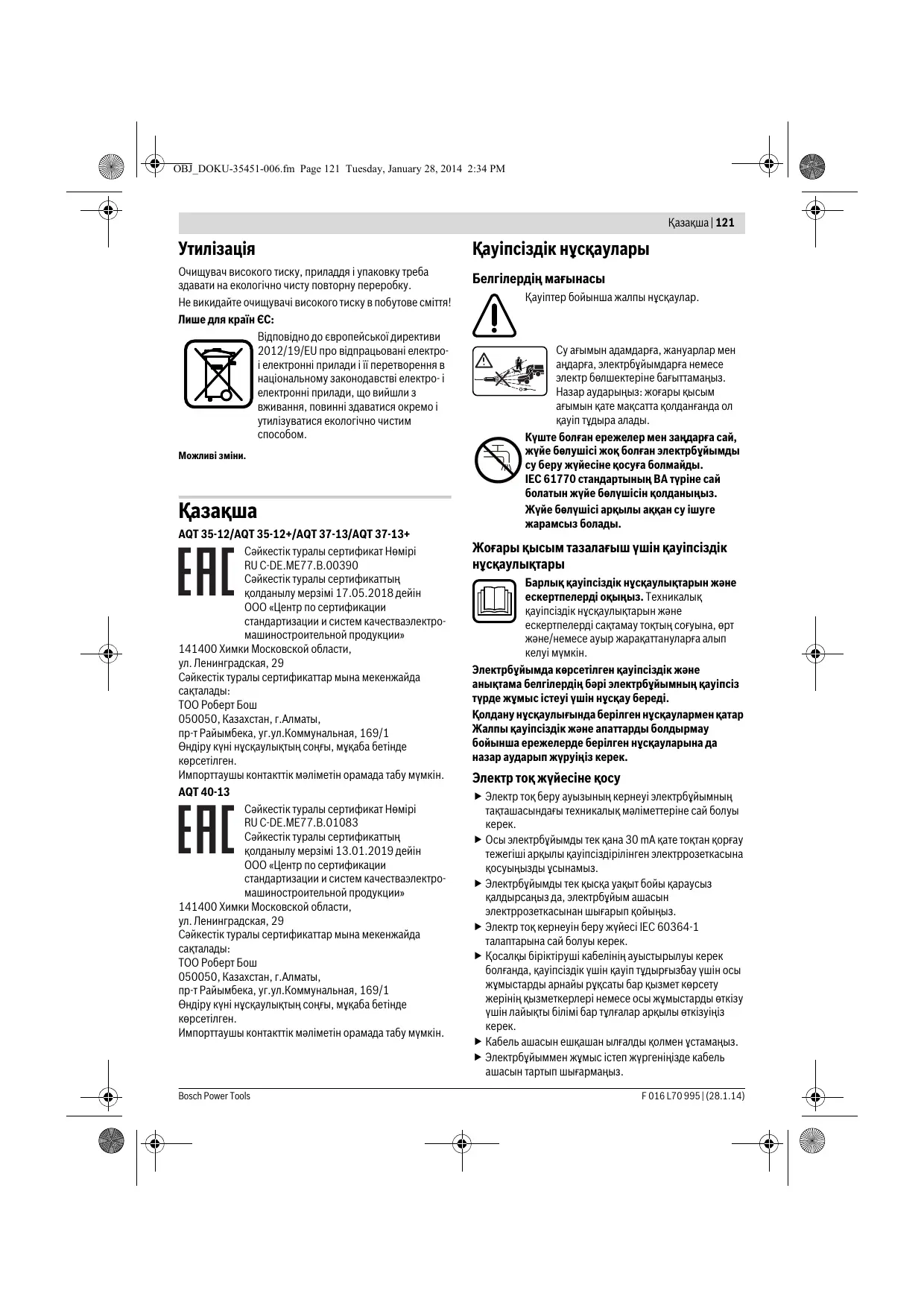 Очищувач високого тиску, приладдя і упаковку треба здавати на екологічно чисту повторну переробку. Не викидайте очищувачі високого тиску в побутове сміття! Лише для країн ЄС: Відповідно до європейської директиви 2012/19/EU про відпрацьовані електроі електронні прилади і її перетворення в національному законодавстві електро- і електронні прилади, що вийшли з вживання, повинні здаватися окремо і утилізуватися екологічно чистим Можливі зміни. Қaзақша AQT 35-12/AQT 35-12+/AQT 37-13/AQT 37-13+ Сәйкестік туралы сертификат Нөмірi RU C-DE.ME77.B.00390 Сәйкестік туралы сертификаттың қолданылу мерзімі 17.05.2018 дейін ООО «Центр по сертификации стандартизации и систем качестваэлектромашиностроительной продукции» 141400 Химки Московской области, ул. Ленинградская, 29 Сәйкестік туралы сертификаттар мына мекенжайда ТОО Роберт Бош 050050, Казахстан, г.Алматы, пр-т Райымбека, уг.ул.Коммунальная, 169/1 Өндіру күні нұсқаулықтың соңғы, мұқаба бетінде көрсетілген. Импорттаушы контакттік мәліметін орамада табу мүмкін. AQT 40-13 Сәйкестік туралы сертификат Нөмірi RU C-DE.ME77.B.01083 Сәйкестік туралы сертификаттың қолданылу мерзімі 13.01.2019 дейін ООО «Центр по сертификации стандартизации и систем качестваэлектромашиностроительной продукции» 141400 Химки Московской области, ул. Ленинградская, 29 Сәйкестік туралы сертификаттар мына мекенжайда ТОО Роберт Бош 050050, Казахстан, г.Алматы, пр-т Райымбека, уг.ул.Коммунальная, 169/1 Өндіру күні нұсқаулықтың соңғы, мұқаба бетінде көрсетілген. Импорттаушы контакттік мәліметін орамада табу мүмкін. Bosch Power Tools Қауіпсіздік нұсқаулары Белгілердің мағынасы Қауіптер бойынша жалпы нұсқаулар. Су ағымын адамдарға, жануарлар мен аңдарға, электрбұйымдарға немесе электр бөлшектеріне бағыттамаңыз. Назар аударыңыз: жоғары қысым ағымын қате мақсатта қолданғанда ол қауіп тұдыра алады. Күште болған ережелер мен заңдарға сай, жүйе бөлушісі жоқ болған электрбұйымды су беру жүйесіне қосуға болмайды. IEC 61770 стандартының ВА түріне сай болатын жүйе бөлүшісін қолданыңыз. Жүйе бөлүшісі арқылы аққан су ішуге жарамсыз болады. Жоғары қысым тазалағыш үшін қауіпсіздік нұсқаулықтары Барлық қауіпсіздік нұсқаулықтарын және ескертпелерді оқыңыз. Техникалық қауіпсіздік нұсқаулықтарын және ескертпелерді сақтамау тоқтың соғуына, өрт және/немесе ауыр жарақаттануларға алып келуі мүмкін. Электрбұйымда көрсетілген қауіпсіздік және анықтама белгілердің бәрі электрбұйымның қауіпсіз түрде жұмыс істеуі үшін нұсқау береді. Қолдану нұсқаулығында берілген нұсқаулармен қатар Жалпы қауіпсіздік және апаттарды болдырмау бойынша ережелерде берілген нұсқауларына да назар аударып жүруіңіз керек. Электр тоқ жүйесіне қосу Электр тоқ беру ауызының кернеуі электрбұйымның тақташасындағы техникалық мәліметтеріне сай болуы Осы электрбұйымды тек қана 30 mA қате тоқтан қорғау тежегіші арқылы қауіпсіздірілінген электррозеткасына қосуыңызды ұсынамыз. Электрбұйымды тек қысқа уақыт бойы қараусыз қалдырсаңыз да, электрбұйым ашасын электррозеткасынан шығарып қойыңыз. Электр тоқ кернеуін беру жүйесі IEC 60364-1 талаптарына сай болуы керек. Қосалқы біріктіруші кабелінің ауыстырылуы керек болғанда, қауіпсіздік үшін қауіп тұдырғызбау үшін осы жұмыстарды арнайы рұқсаты бар қызмет көрсету жерінің қызметкерлері немесе осы жұмыстарды өткізу үшін лайықты білімі бар тұлғалар арқылы өткізуіңіз Кабель ашасын ешқа