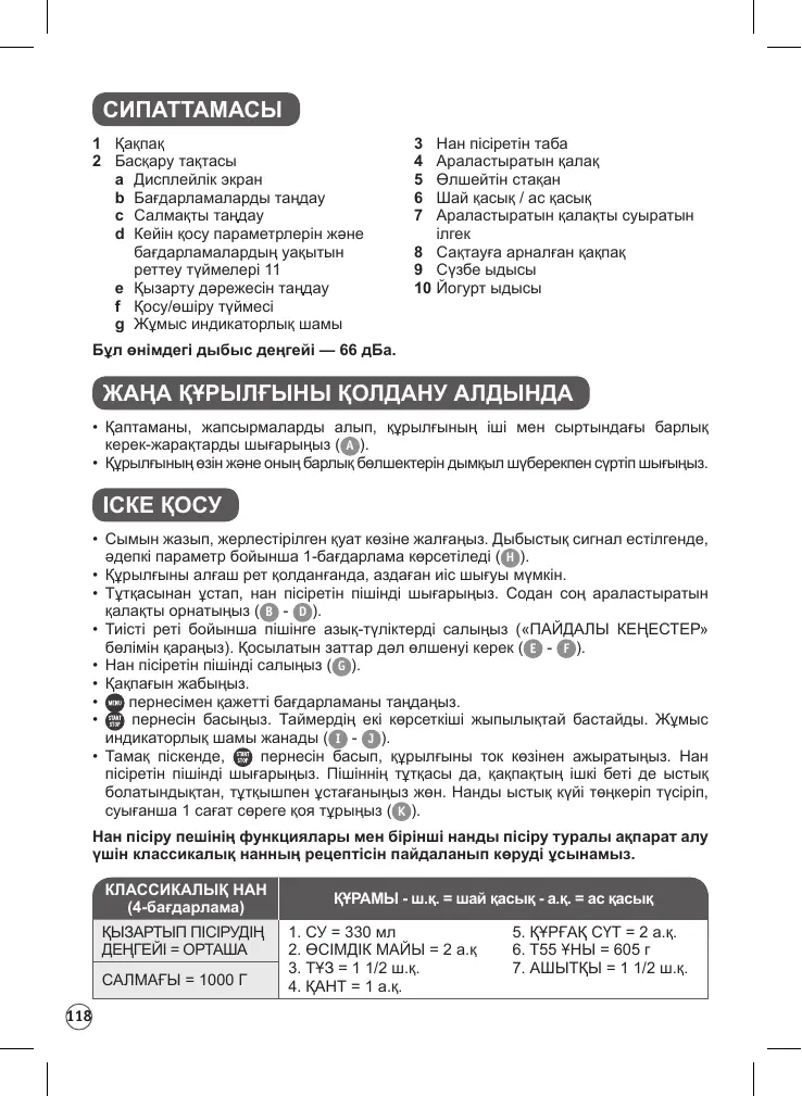 ПАЙДАЛЫ КЕҢЕСТЕР 1. Салынған азық-түліктер бөлме температурасында (нұсқау басқаша жазылмаса) болуы және дәл өлшенуі керек. Сұйықтықтарды жинақтағы өлшегіш стақанмен өлшеңіз. Жинақтағы қасықтың бір жағы ас қасық, ал екінші жағы шай қасық мөлшерімен бірдей. Дұрыс өлшенбесе, нәтиже дұрыс шықпайды. Нан температура мен ылғалдылыққа өте сезімтал келеді. Күн ыстық болғанда, сұйықтықтарды салқындатып құйған дұрыс. Сол сияқты суық кезде суды немесе сүтті жылыту (бірақ 35°C-тан асыруға болмайды) қажет болуы мүмкін.