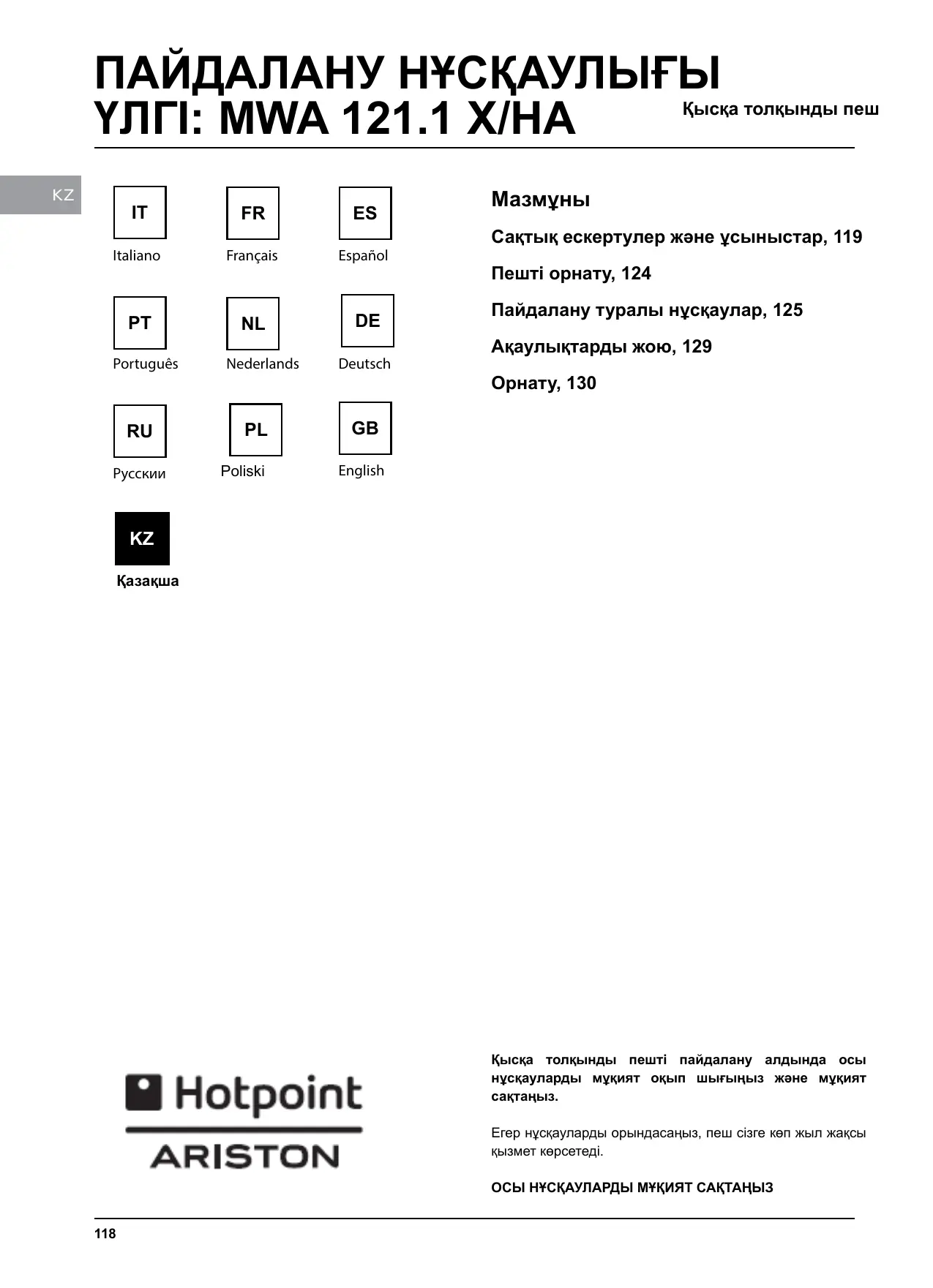 Қысқа толқынды пешті пайдалану алдында осы нұсқауларды мұқият оқып шығыңыз және мұқият сақтаңыз. Егер нұсқауларды орындасаңыз, пеш сізге көп жыл жақсы қызмет көрсетеді. ОСЫ НҰСҚАУЛАРДЫ МҰҚИЯТ САҚТАҢЫЗ 118