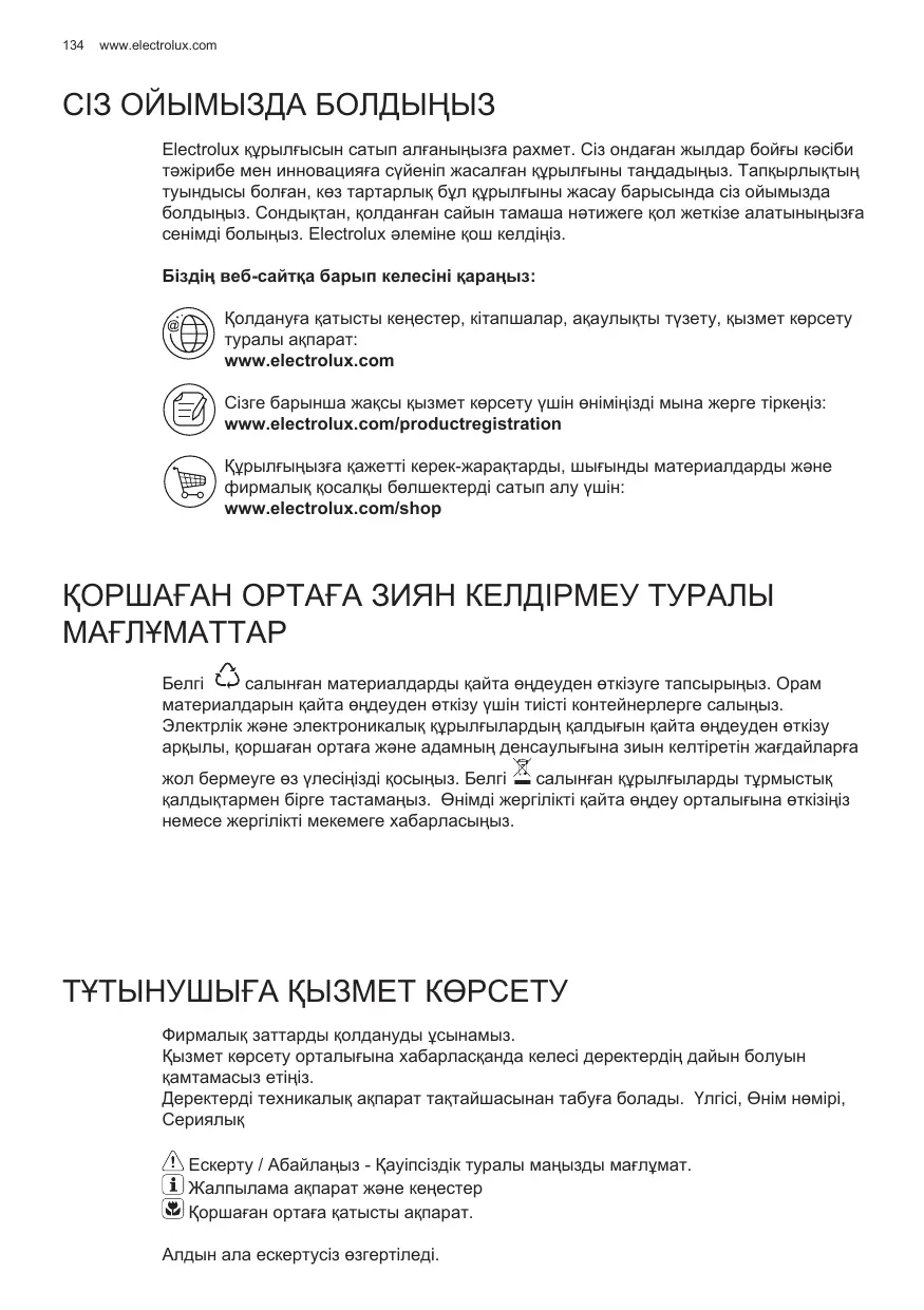 www.electrolux.com СІЗ ОЙЫМЫЗДА БОЛДЫҢЫЗ Electrolux құрылғысын сатып алғаныңызға рахмет. Сіз ондаған жылдар бойғы кəсіби тəжірибе мен инновацияға сүйеніп жасалған құрылғыны таңдадыңыз. Тапқырлықтың туындысы болған, көз тартарлық бұл құрылғыны жасау барысында сіз ойымызда болдыңыз. Сондықтан, қолданған сайын тамаша нəтижеге қол жеткізе алатыныңызға сенімді болыңыз. Electrolux əлеміне қош келдіңіз. Біздің веб-сайтқа барып келесіні қараңыз: Қолдануға қатысты кеңестер, кітапшалар, ақаулықты түзету, қызмет көрсету туралы ақпарат: www.electrolux.com Сізге барынша жақсы қызмет көрсету үшін өніміңізді мына жерге тіркеңіз: www.electrolux.com/productregistration Құрылғыңызға қажетті керек-жарақтарды, шығынды материалдарды жəне фирмалық қосалқы бөлшектерді сатып алу үшін: www.electrolux.com/shop ҚОРШАҒАН ОРТАҒА ЗИЯН КЕЛДІРМЕУ ТУРАЛЫ МАҒЛҰМАТТАР салынған материалдарды қайта өңдеуден өткізуге тапсырыңыз. Орам материалдарын қайта өңдеуден өткізу үшін тиісті контейнерлерге салыңыз. Электрлік жəне электроникалық құрылғылардың қалдығын қайта өңдеуден өткізу арқылы, қоршаған ортаға жəне адамның денсаулығына зиын келтіретін жағдайларға жол бермеуге өз үлесіңізді қосыңыз. Белгі салынған құрылғыларды тұрмыстық қалдықтармен бірге тастамаңыз. Өнімді жергілікті қайта өңдеу орталығына өткізіңіз немесе жергілікті мекемеге хабарласыңыз. ТҰТЫНУШЫҒА ҚЫЗМЕТ КӨРСЕТУ Фирмалық заттарды қолдануды ұсынамыз. Қызмет көрсету орталығына хабарласқанда келесі деректердің дайын болуын қамтамасыз етіңіз. Деректерді техникалық ақпарат тақтайшасынан табуға болады. Үлгісі, Өнім нөмірі, Ескерту / Абайлаңыз - Қауіпсіздік туралы маңызды мағлұмат. Жалпылама ақпарат жəне кеңестер Қоршаған ортаға қатысты ақпарат. Алдын ала ескертусіз өзгертіледі.