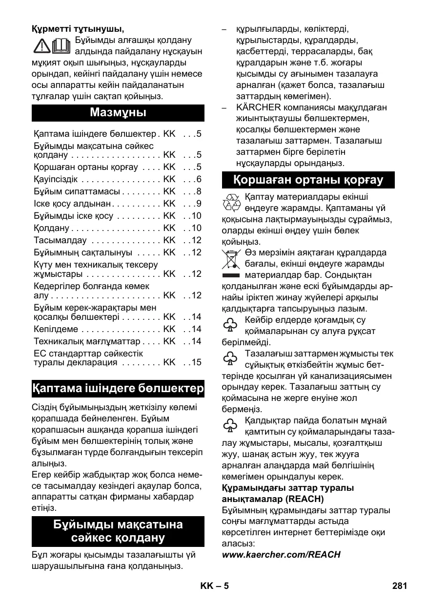 . . .5 . . .6 EN 60335–1 EN 60335–2–79 EN 61000–3–2: 2006+A1: 2009+A2: 2009 EN 61000–3–3: 2008 EN 62233: 2008 Angewandtes Konformitätsbewertungsverfahren 2000/14/EG: Anhang V Schallleistungspegel dB(A) EN 60335–1 EN 60335–2–79 EN 61000–3–2: 2006+A1: 2009+A2: 2009 EN 61000–3–3: 2008 EN 62233: 2008 Applied conformity evaluation method 2000/14/EC: Appendix V Sound power level dB(A) Measured: Ce nettoyeur haute pression ne doit être utilisé que pour un usage privé: – pour le nettoyage de machines, véhicules, bâtiments, outils, façades, terrasses, outils de jardinage etc. avec un jet d'eau sous pression (et si besoin en ajoutant des détergents). – avec des accessoires, pièces de rechange et détergents homologués par KÄRCHER. Veuillez respecter les consignes livrées avec les détergents.
