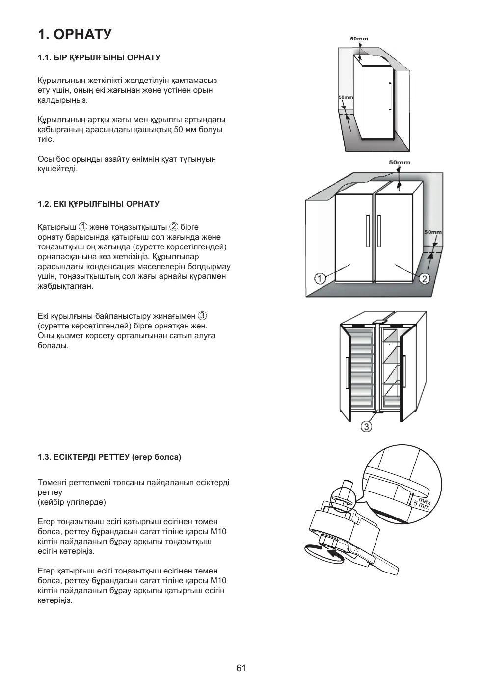 1.2. ЕКІ ҚҰРЫЛҒЫНЫ ОРНАТУ Қатырғыш 1 және тоңазытқышты 2 бірге орнату барысында қатырғыш сол жағында және тоңазытқыш оң жағында (суретте көрсетілгендей) орналасқанына көз жеткізіңіз. Құрылғылар арасындағы конденсация мәселелерін болдырмау үшін, тоңазытқыштың сол жағы арнайы құралмен жабдықталған. Екі құрылғыны байланыстыру жинағымен 3 (суретте көрсетілгендей) бірге орнатқан жөн. Оны қызмет көрсету орталығынан сатып алуға болады.