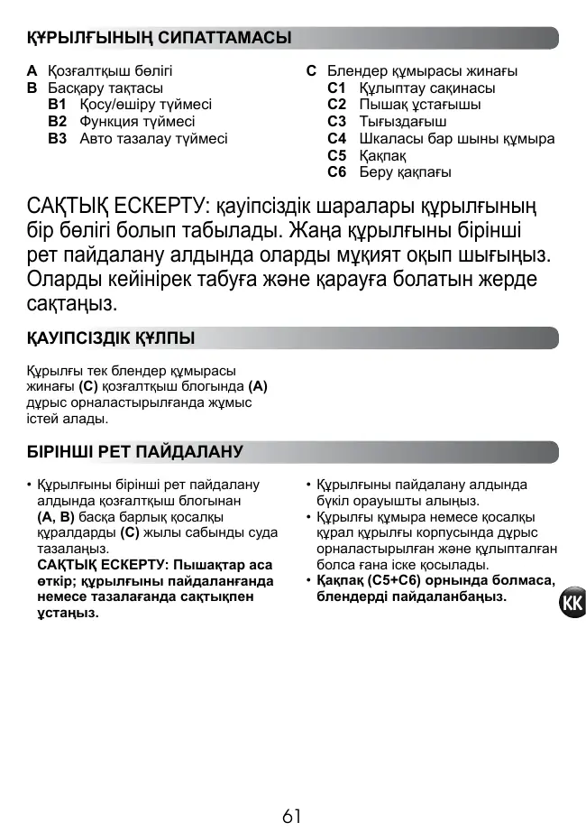 • Vérifiez que tous les éléments d'emballage ont été retirés avant d'utiliser l'appareil. • L'appareil démarre uniquement si le bol ou l'accessoire est correctement positionné et verrouillé sur le bloc moteur. • N'utilisez pas le blender si le couvercle (C5+C6) n'est pas en place.