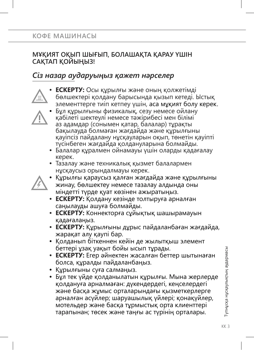 - Бұл тек үйде қолданылатын құрылғы. Мына жерлерде қолдануға арналмаған: дүкендердегі, кеңселердегі және басқа жұмыс орталарындағы қызметкерлерге арналған асүйлер; шаруашылық үйлері; қонақүйлер, мотельдер және басқа тұрмыстық орта клиенттері тарапынан; төсек және таңғы ас түрінің орталары. Түпнұсқа нұсқаулықтың аудармасы Сіз назар аударуыңыз қажет нәрселер KK 3 КОФЕ МАШИНАСЫ