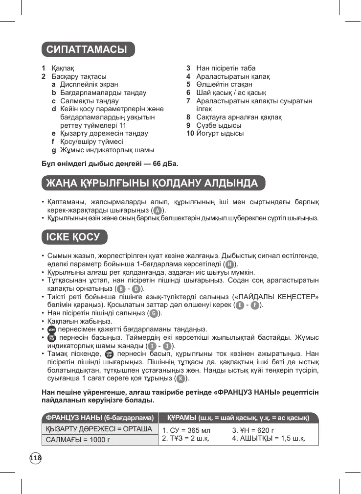 ІСКЕ ҚОСУ • Сымын жазып, жерлестірілген қуат көзіне жалғаңыз. Дыбыстық сигнал естілгенде, әдепкі параметр бойынша 1-бағдарлама көрсетіледі ( H ). • Құрылғыны алғаш рет қолданғанда, аздаған иіс шығуы мүмкін. • Тұтқасынан ұстап, нан пісіретін пішінді шығарыңыз. Содан соң араластыратын қалақты орнатыңыз ( B - D ). • Тиісті реті бойынша пішінге азық-түліктерді салыңыз («ПАЙДАЛЫ КЕҢЕСТЕР» бөлімін қараңыз). Қосылатын заттар дәл өлшенуі керек ( E - F ). • Нан пісіретін пішінді салыңыз ( G ). • Қақпағын жабыңыз. • пернесімен қажетті бағдарламаны таңдаңыз. • пернесін басыңыз. Таймердің екі көрсеткіші жыпылықтай бастайды. Жұмыс индикаторлық шамы жанады ( I - J ). • Тамақ піскенде, пернесін басып, құрылғыны ток көзінен ажыратыңыз. Нан пісіретін пішінді шығарыңыз. Пішіннің тұтқасы да, қақпақтың ішкі беті де ыстық болатындықтан, тұтқышпен ұстағаныңыз жөн. Нанды ыстық күйі төңкеріп түсіріп, суығанша 1 сағат сөреге қоя тұрыңыз ( K ). Нан пешіне үйренгенше, алғаш тәжірибе ретінде «ФРАНЦУЗ НАНЫ» рецептісін пайдаланып көруіңізге болады. ФРАНЦУЗ НАНЫ (6-бағдарлама) ҚЫЗАРТУ ДӘРЕЖЕСІ = ОРТАША САЛМАҒЫ = 1000 г 118
