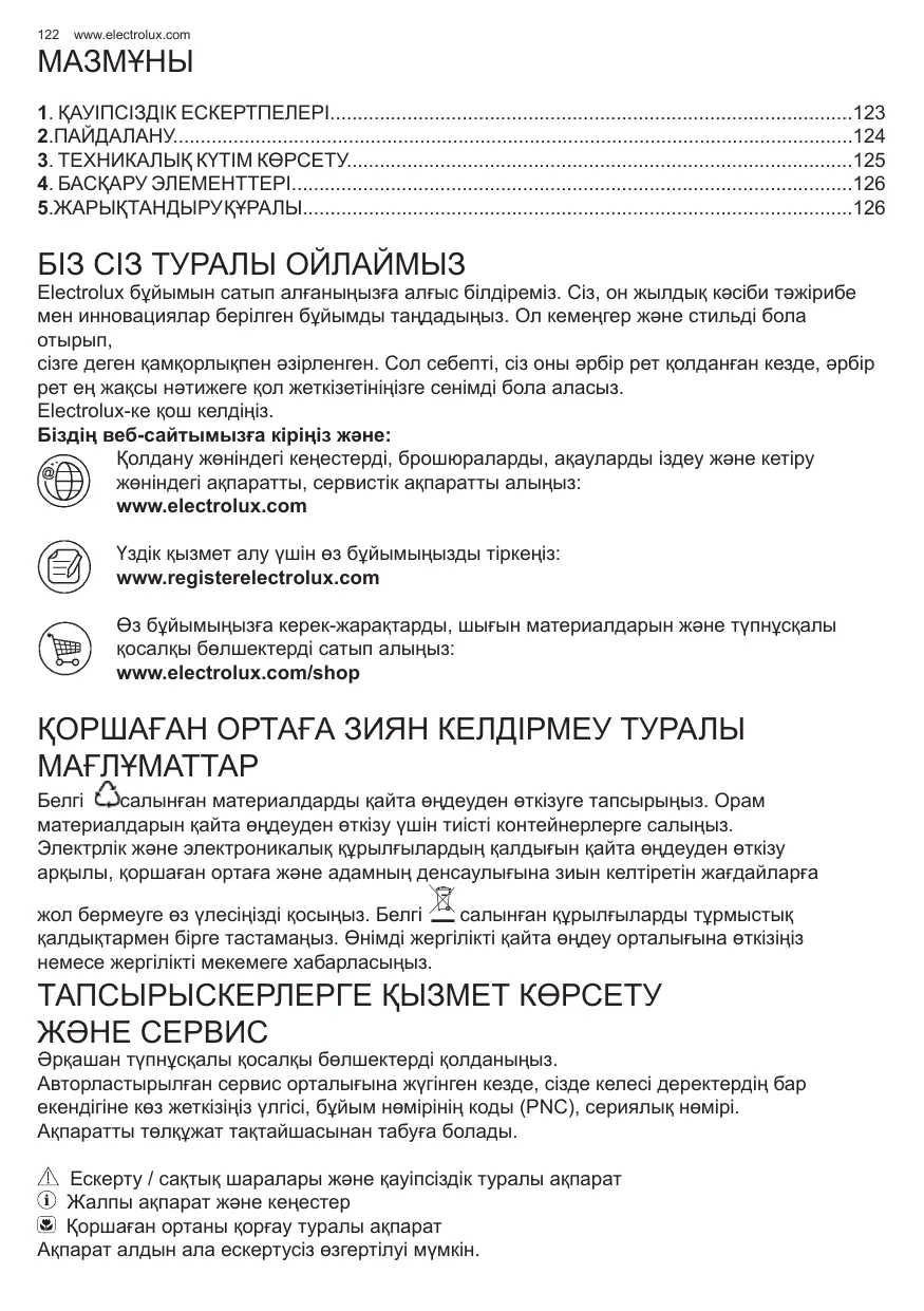 Electrolux бұйымын сатып алғаныңызға алғыс білдіреміз. Сіз, он жылдық кəсіби тəжірибе мен инновациялар берілген бұйымды таңдадыңыз. Ол кемеңгер жəне стильді бола отырып, сізге деген қамқорлықпен əзірленген. Сол себепті, сіз оны əрбір рет қолданған кезде, əрбір рет ең жақсы нəтижеге қол жеткізетініңізге сенімді бола аласыз. Electrolux-ке қош келдіңіз. Біздің веб-сайтымызға кіріңіз жəне: Қолдану жөніндегі кеңестерді, брошюраларды, ақауларды іздеу жəне кетіру жөніндегі ақпаратты, сервистік ақпаратты алыңыз: www.electrolux.com Үздік қызмет алу үшін өз бұйымыңызды тіркеңіз: www.registerelectrolux.com Өз бұйымыңызға керек-жарақтарды, шығын материалдарын жəне түпнұсқалы қосалқы бөлшектерді сатып алыңыз: www.electrolux.com/shop