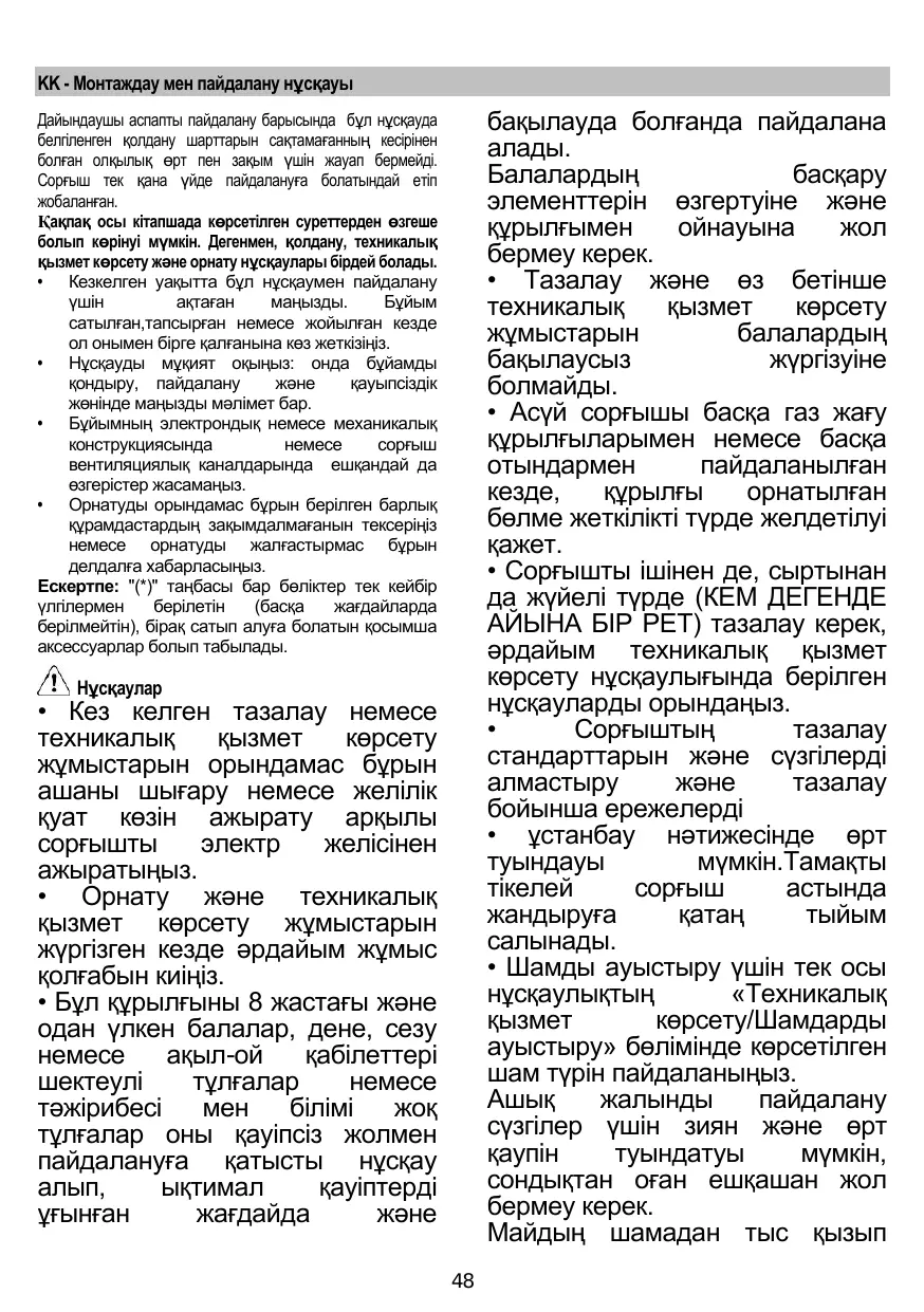 бақылауда болғанда пайдалана алады. Балалардың басқару элементтерін өзгертуіне және құрылғымен ойнауына жол бермеу керек. • Тазалау және өз бетінше техникалық қызмет көрсету жұмыстарын балалардың бақылаусыз жүргізуіне болмайды. • Асүй сорғышы басқа газ жағу құрылғыларымен немесе басқа отындармен пайдаланылған кезде, құрылғы орнатылған бөлме жеткілікті түрде желдетілуі қажет. • Сорғышты ішінен де, сыртынан да жүйелі түрде (КЕМ ДЕГЕНДЕ АЙЫНА БІР РЕТ) тазалау керек, әрдайым техникалық қызмет көрсету нұсқаулығында берілген нұсқауларды орындаңыз. • Сорғыштың тазалау стандарттарын және сүзгілерді алмастыру және тазалау бойынша ережелерді • ұстанбау нәтижесінде өрт туындауы мүмкін.Тамақты тікелей сорғыш астында жандыруға қатаң тыйым салынады. • Шамды ауыстыру үшін тек осы нұсқаулықтың «Техникалық қызмет көрсету/Шамдарды ауыстыру» бөлімінде көрсетілген шам түрін пайдаланыңыз. Ашық жалынды пайдалану сүзгілер үшін зиян және өрт қаупін туындатуы мүмкін, сондықтан оған ешқашан жол бермеу керек. Майдың шамадан тыс қызып