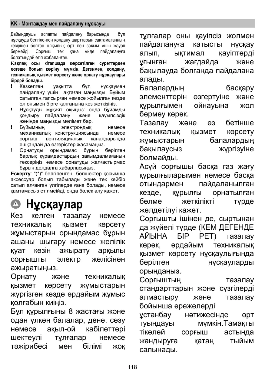 KK - Монтаждау мен пайдалану нұсқауы Дайындаушы аспапты пайдалану барысында нұсқауда белгіленген қолдану шарттарын сақтамағанның кесірінен болған олқылық өрт пен зақым үшін жауап бермейді. Сорғыш тек қана үйде пайдалануға болатындай етіп жобаланған. Қақпақ осы кітапшада көрсетілген суреттерден өзгеше болып көрінуі мүмкін. Дегенмен, қолдану, техникалық қызмет көрсету жəне орнату нұсқаулары бірдей болады. ! Кезкелген