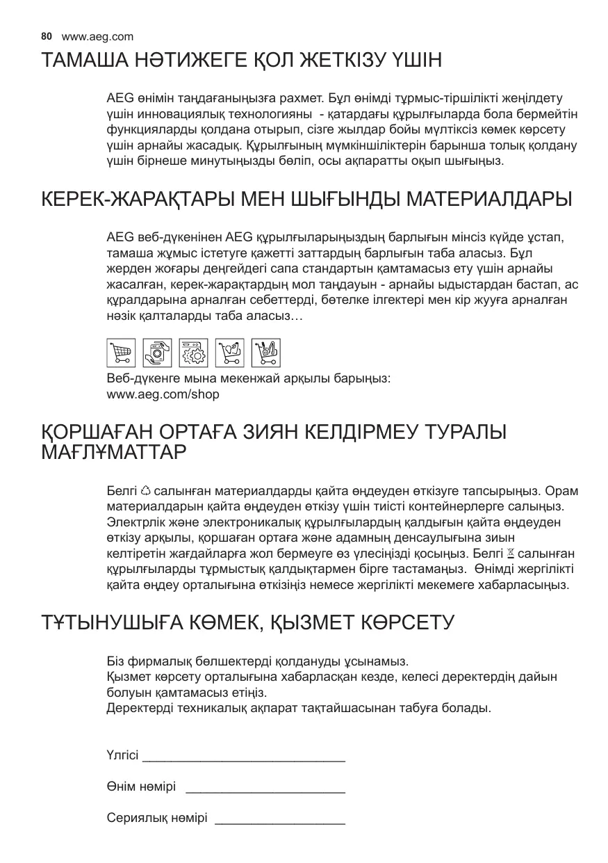 показва необходимост от измиване на металните филтри за мазнини. Алармата се включва след 100 часа работа на аспиратора. показва нужда от смяна на филтрите с активен въглен и измиване на металните филтри за мазнини. Алармата се включва след 200 часа работа на аспиратора. Изписва активната скорост и точката долу вдясно мига, сменявайки се с оставащото време. - С светва двукратно, алармата на филтъра с А.В. е активирана. - С светва еднократно - алармата на филтъра с А.В. е деактивирана. 80 www.aeg.com ТАМАША НӘТИЖЕГЕ ҚОЛ ЖЕТКІЗУ ҮШІН AEG өнімін таңдағаныңызға рахмет. Бұл өнімді тұрмыс-тіршілікті жеңілдету үшін инновациялық технологияны - қатардағы құрылғыларда бола бермейтін функцияларды қолдана отырып, сізге жылдар бойы мүлтіксіз көмек көрсету үшін арнайы жасадық. Құрылғының мүмкіншіліктерін барынша толық қолдану үшін бірнеше минутыңызды бөліп, осы ақпаратты оқып шығыңыз. КЕРЕК-ЖАРАҚТАРЫ МЕН ШЫҒЫНДЫ МАТЕРИАЛДАРЫ AEG веб-дүкенінен AEG құрылғыларыңыздың барлығын мінсіз күйде ұстап, тамаша жұмыс істетуге қажетті заттардың барлығын таба аласыз. Бұл жерден жоғары деңгейдегі сапа стандартын қамтамасыз ету үшін арнайы жасалған, керек-жарақтардың мол таңдауын - арнайы ыдыстардан бастап, ас құралдарына арналған себеттерді, бөтелке ілгектері мен кір жууға арналған нәзік қалталарды таба аласыз… Веб-дүкенге мына мекенжай арқылы барыңыз: www.aeg.com/shop ҚОРШАҒАН ОРТАҒА ЗИЯН КЕЛДІРМЕУ ТУРАЛЫ МАҒЛҰМАТТАР Белгі салынған материалдарды қайта өңдеуден өткізуге тапсырыңыз. Орам материалдарын қайта өңдеуден өткізу үшін тиісті контейнерлерге салыңыз. Электрлік және электроникалық құрылғылардың қалдығын қайта өңдеуден өткізу арқылы, қоршаған ортаға және адамның денсаулығына зиын келтіретін жағдайларға жол бермеуге өз үлесіңізді қосыңыз. Белгі салынған құрылғыларды тұрмыстық қалдықтармен бірге тастамаңыз. Өнімді жергілікті қайта өңдеу орталығына өткізіңіз немесе жергілікті мекемеге хабарласыңыз. ТҰТЫНУШЫҒА КӨМЕК, ҚЫЗМЕТ КӨРСЕТУ Біз фирмалық бөлшектерді қолдануды ұсынамыз. Қызмет көрсету орталығына хабарласқан кезде, келесі деректердің дайын болуын қамтамасыз етіңіз. Деректерді техникалық ақпарат тақтайшасынан табуға болады. Үлгісі _____________________________ Өнім нөмірі _______________________ Сериялық нөмірі ___________________ KAZAKH