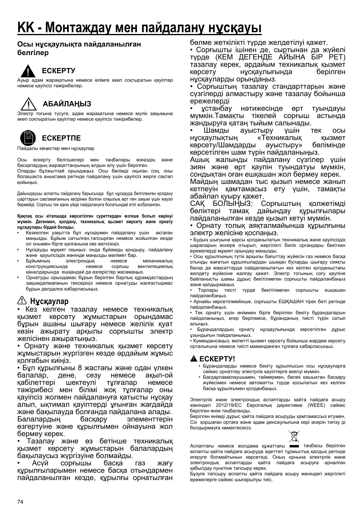 KK - Монтаждау мен пайдалану нұсқауы Осы нұсқаулықта пайдаланылған белгілер ЕСКЕРТУ Ауыр адам жарақатына немесе өлімге əкеп соқтыратын қауіптер немесе қауіпсіз тəжірибелер.
