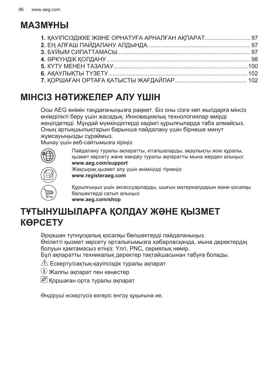 Пайдалану туралы ақпаратты, кітапшаларды, ақаулықты жою құралы, қызмет көрсету және жөндеу туралы ақпаратты мына жерден алыңыз: www.aeg.com/support Жақсырақ қызмет алу үшін өніміңізді тіркеңіз: www.registeraeg.com Құрылғыңыз үшін аксессуарларды, шығын материалдарын және қосалқы бөлшектерді сатып алыңыз: www.aeg.com/shop