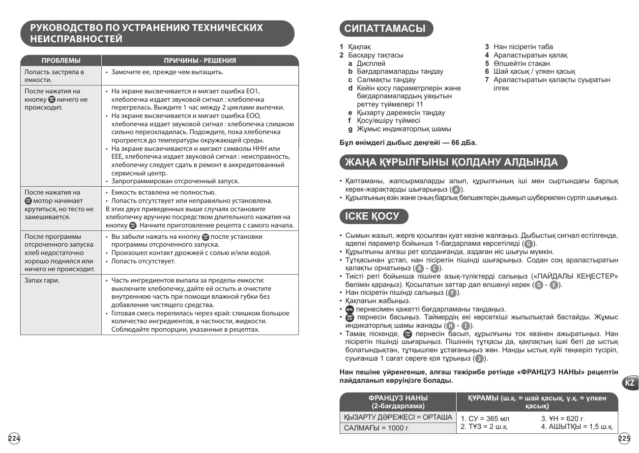 ПАЙДАЛЫ КЕҢЕСТЕР 1. Салынған азық-түліктер бөлме температурасында (нұсқау басқаша жазылмаса) болуы және дәл өлшенуі керек. Сұйықтықтарды жинақтағы өлшегіш стақанмен өлшеңіз. Жинақтағы қасықтың бір жағы үлкен қасық, ал екінші жағы шай қасық мөлшерімен бірдей. Дұрыс өлшенбесе, нәтиже дұрыс шықпайды. Нан температура мен ылғалдылыққа өте сезімтал келеді. Бөлменің іші тым ыстық болғанда, сұйықтықтарды салқындатып құйған дұрыс. Сол сияқты суық кезде суды немесе сүтті жылыту (бірақ 35°C-тан асыруға болмайды) қажет болуы мүмкін.